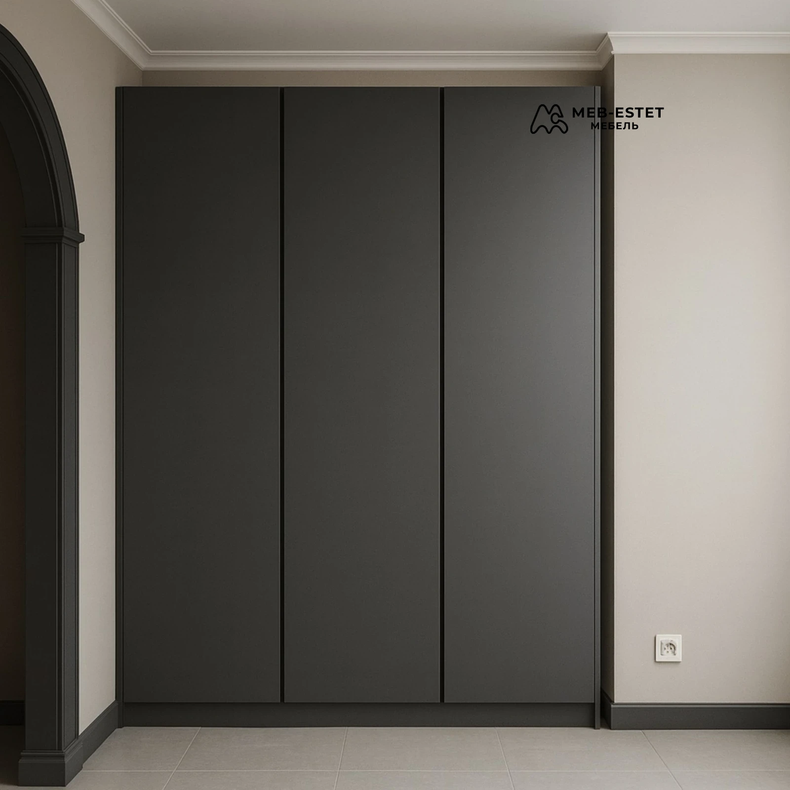Современный встроенный шкаф премиум-класса для прихожей. Фасады из МДФ с матовой эмалью, строгая линейность, скрытые петли и интегрированные ручки для минималистичного силуэта. Корпус выполняется по индивидуальным размерам, возможны полки, выдвижные ящики и штанга для одежды.