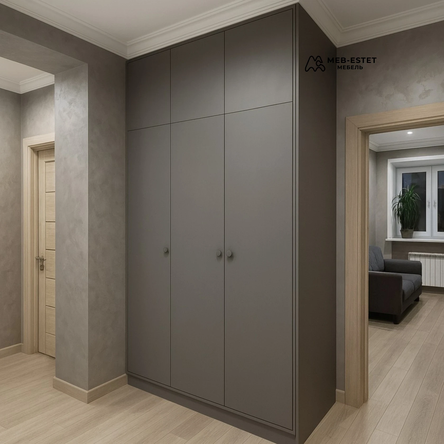 Строгий встроенный шкаф в прихожую — решение в духе минимализма для компактного коридора. Корпус плотно вписан в нишу, фасады матовые, без декоративной раскладки, с небольшими круглыми ручками. Конструкция продумана для длительной эксплуатации: усиленные петли, регулируемые полки и выдвижные ящики.