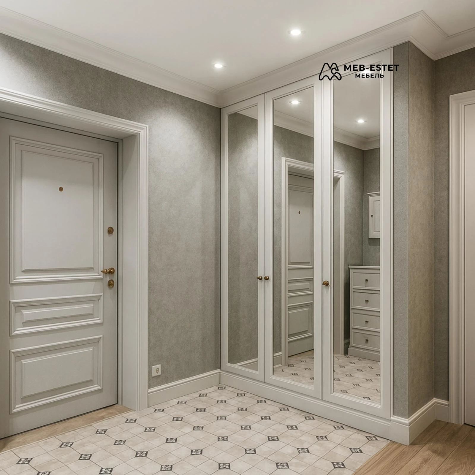 Встроенный распашной шкаф с тремя зеркальными дверями в стиле неоклассика. Выполнен из окрашенного МДФ с декоративной фрезеровкой и лаконичными круглыми ручками — оптимальное решение для холла с ограниченной глубиной.
