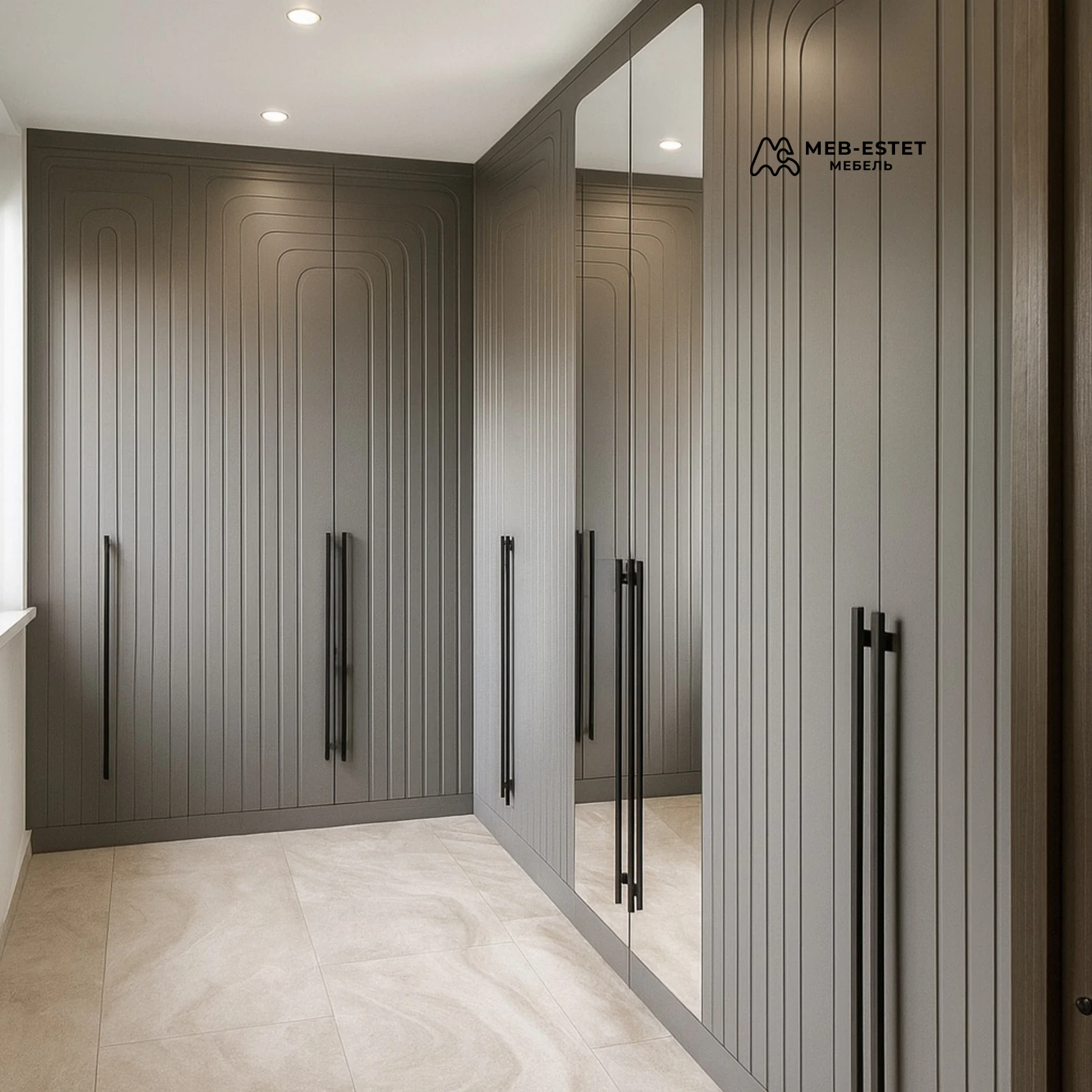 Встроенный шкаф с фрезерованными вертикальными панелями — премиальное решение для прихожей и гардеробной. Матовая поверхность и строгие длинные ручки подчеркивают минималистичный характер. Встроенное зеркало и продуманная внутренняя планировка позволяют сочетать эстетику и функциональность.