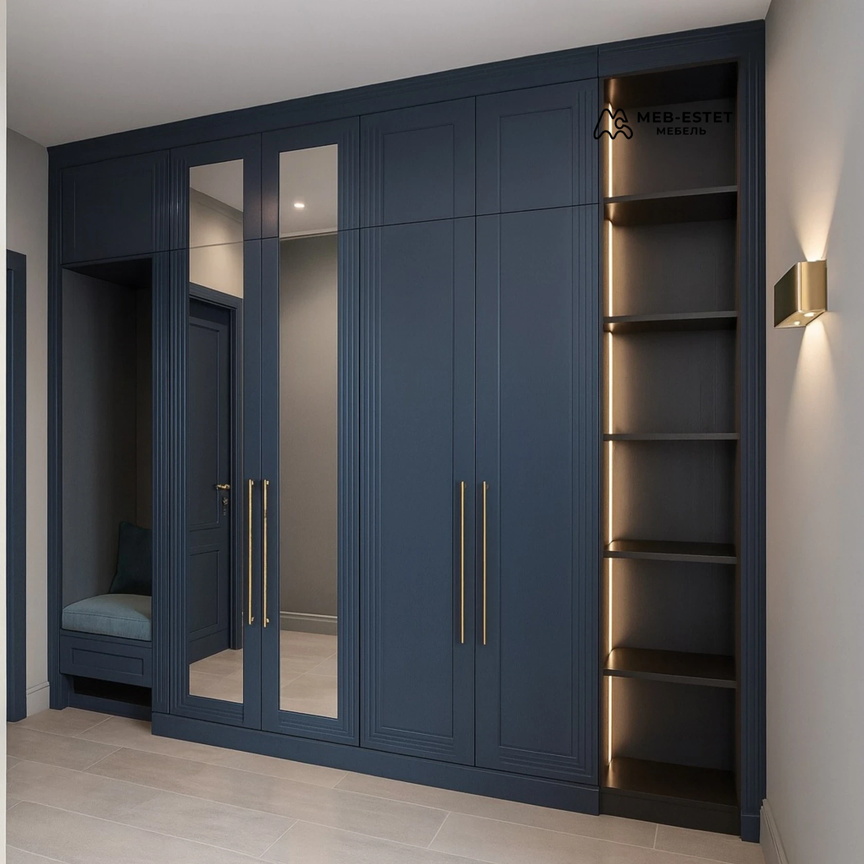 Элегантный встроенный шкаф для прихожей премиум-класса: лаконичная неоклассическая фасадная группа с зеркальными дверями и интегрированной подсветкой. Конструкция продумана под интенсивную эксплуатацию и индивидуальную планировку.