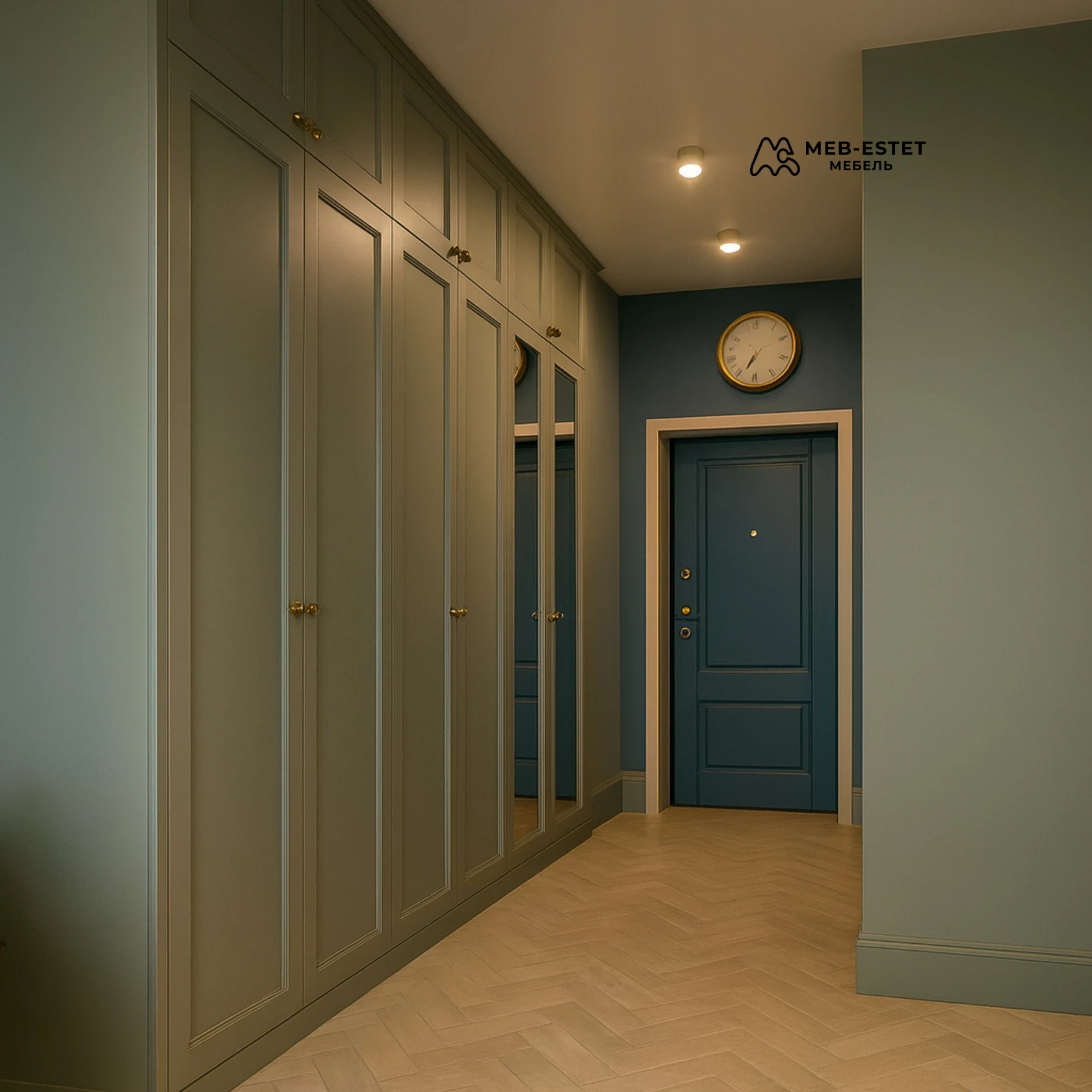 Высокий встроенный шкаф в классической неоклассической манере, выполнен на заказ в окрашенном МДФ с зеркальными вставками и латунной фурнитурой. Подходит для прихожих и коридоров, занимает пространство до потолка.