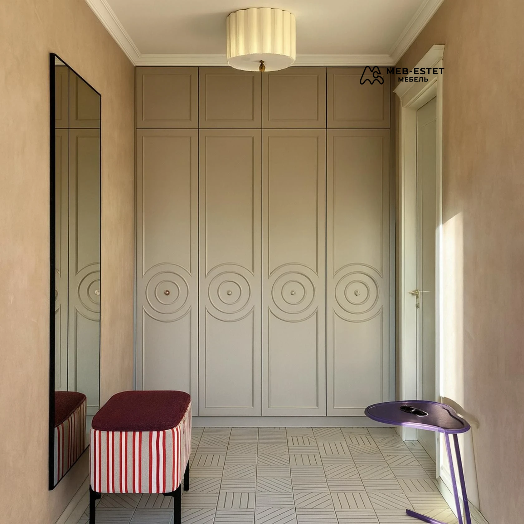 Элегантный встроенный шкаф в неоклассическом стиле — решение для компактной прихожей с акцентной фрезеровкой. Выполнен из окрашенного МДФ с матовой эмалью, верхняя антресоль увеличивает вместимость без потери пропорций.