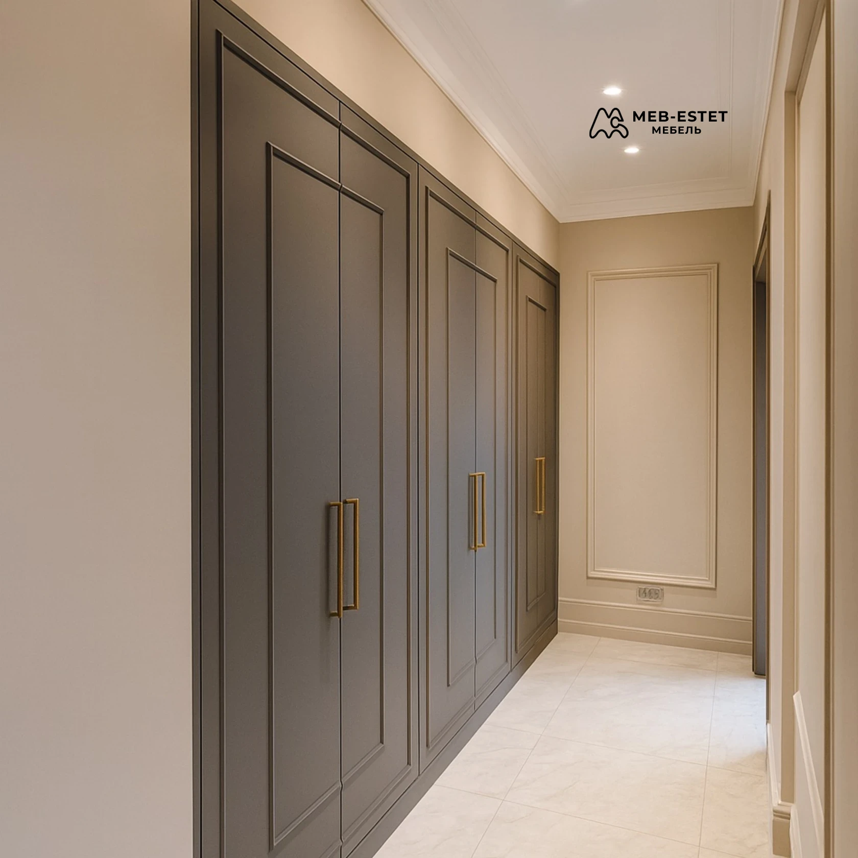 Встроенный распашной шкаф для прихожей из крашеного МДФ с филёнчатыми фасадами и матовой эмалевой поверхностью. Конструкция до потолка, выполнена под нишу, с аккуратным цоколем и выступающими латунными ручками — сочетается с классическим интерьером и современными системами хранения.