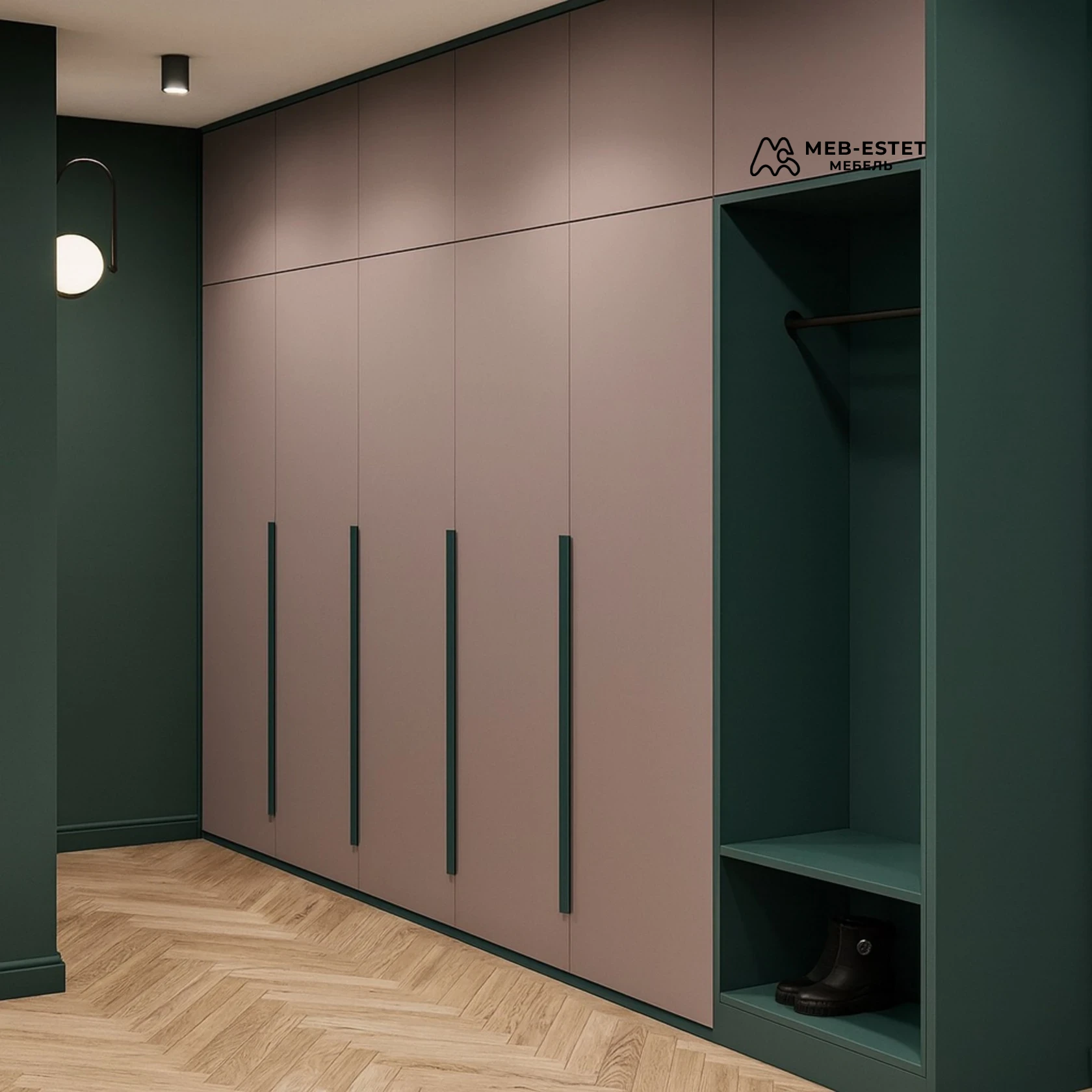 Встроенный шкаф-прихожая премиум-класса, выполнен на заказ с акцентом на чистые геометрии и долговечность. Матовые МДФ фасады обеспечивают ровную фактуру, вертикальные профильные ручки под цвет корпуса — удобны и эстетичны. Внутренняя секция комбинирует штангу для верхней одежды, полки для обуви и нишу для аксесуаров.