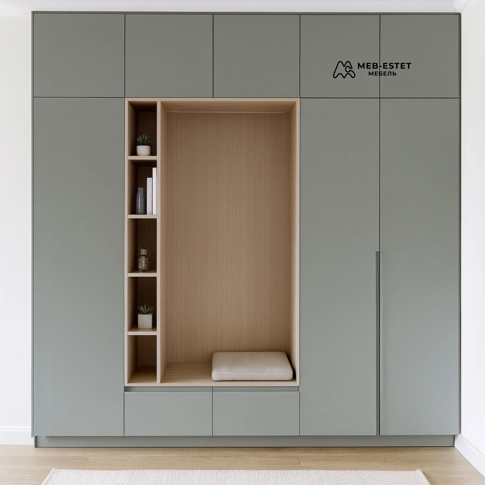 Современный встроенный шкаф для прихожей с центральной нишей для сидения и открытыми полками. Фасады в матовом зелёном тоне сочетаются с тёплым дубовым интерьером ниши — элегантный контраст материалов.