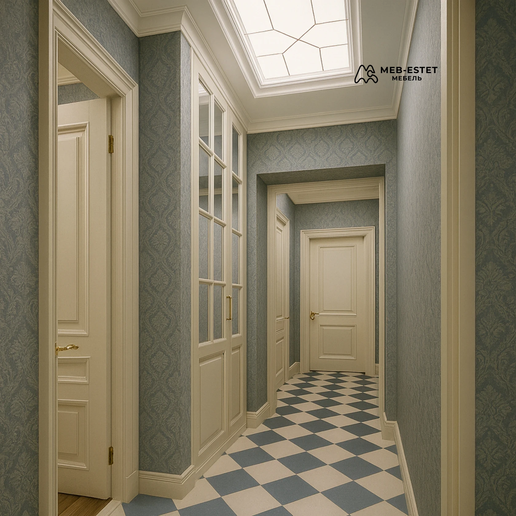 Элегантный встроенный шкаф для прихожей в неоклассическом стиле. Высокие распашные двери с разделёнными стеклянными филёнками и нижними МДФ-панелями создают ощущение легкости и глубины.