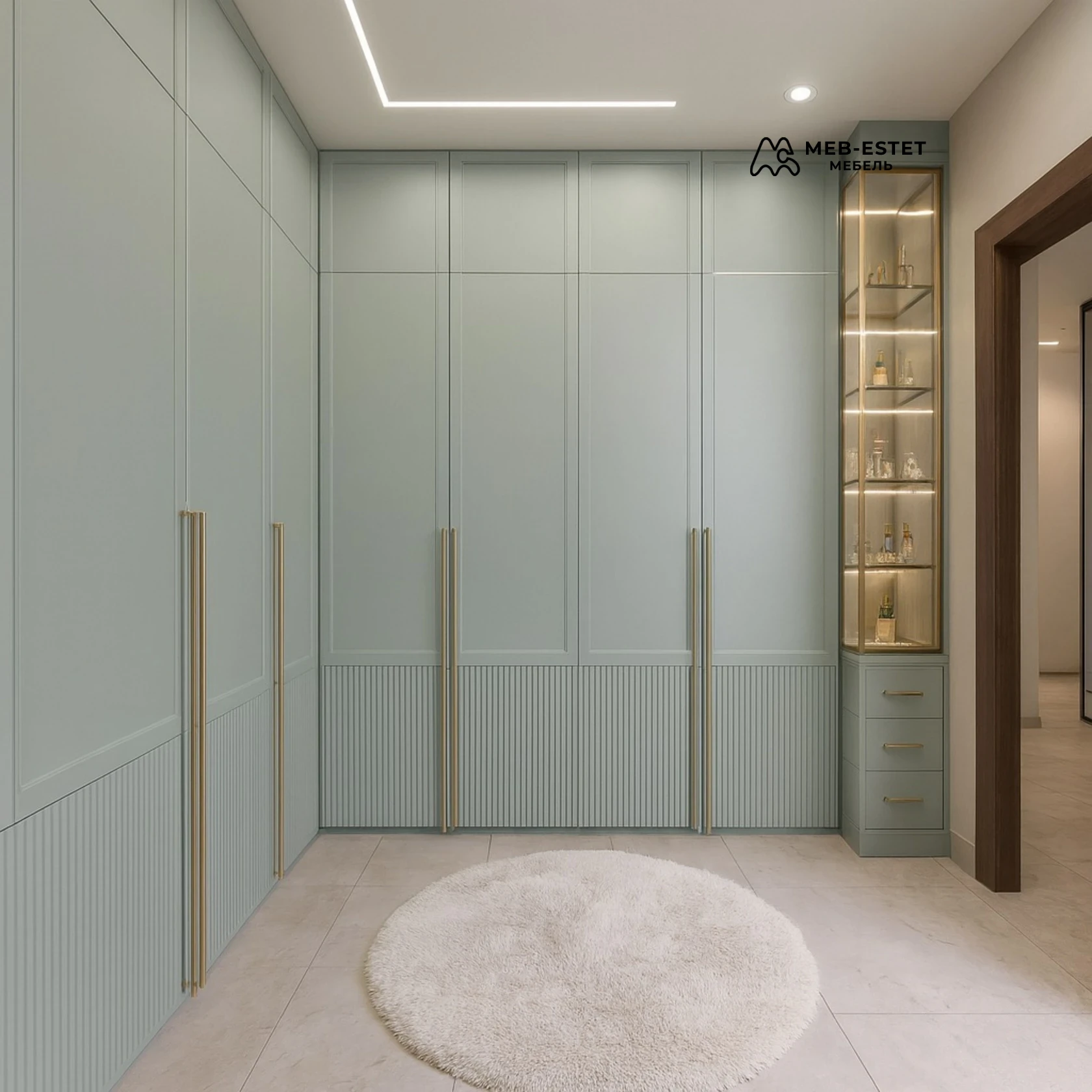Элегантный встроенный шкаф премиум-класса в спокойном зелёном тоне. Панели — матовая окраска по МДФ, нижняя часть выполнена с реечной фактурой, верх — гладкие филёнки. Длинные латунные ручки и узкий стеклянный пенал с подсветкой создают интерьерный акцент.