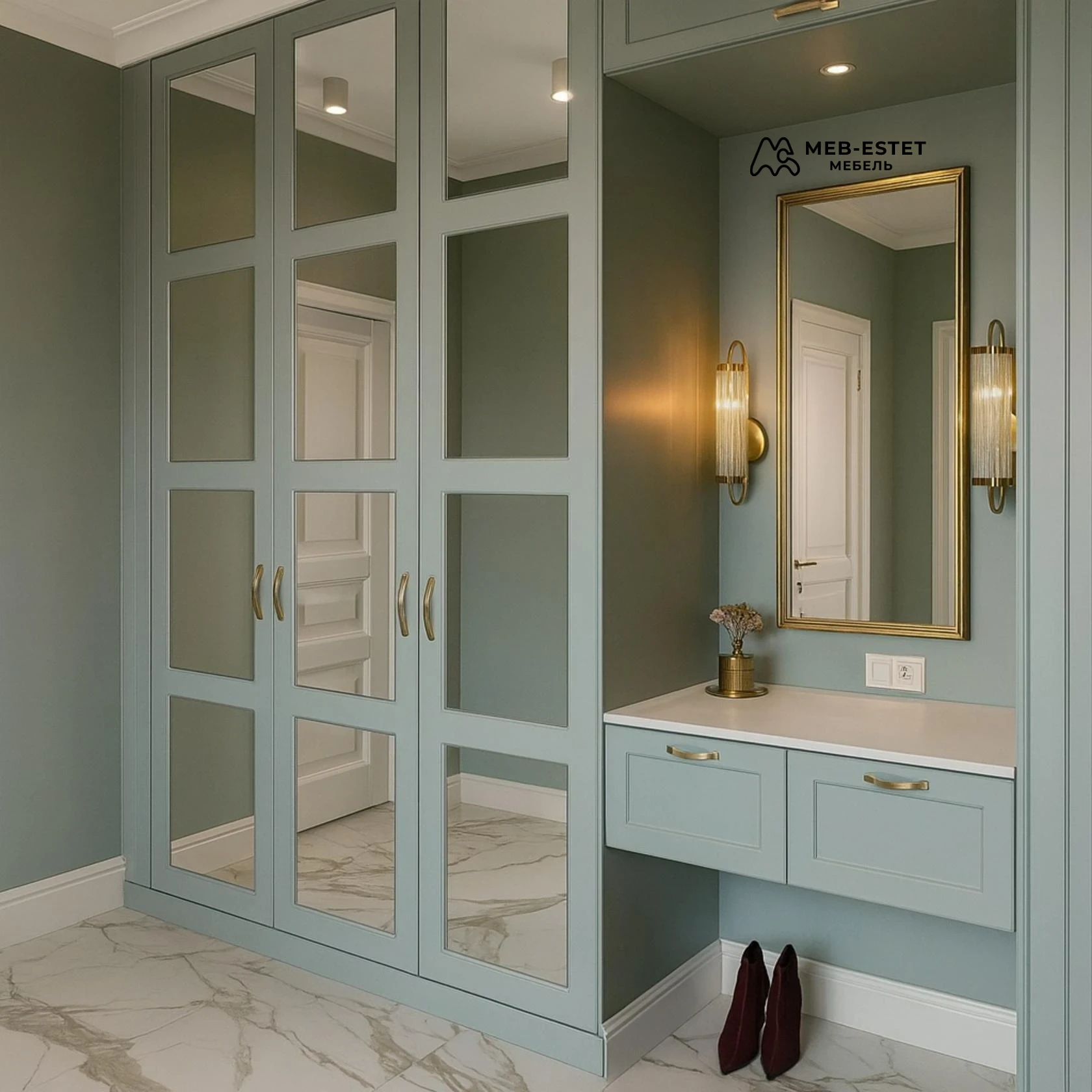 Встроенный шкаф в прихожую с зеркальными филёнками и аккуратной рамкой. Изделие выполнено из окрашенного МДФ в мягком зелёном тоне, дополнено латунной фурнитурой и встроенной консолью с ящиками.