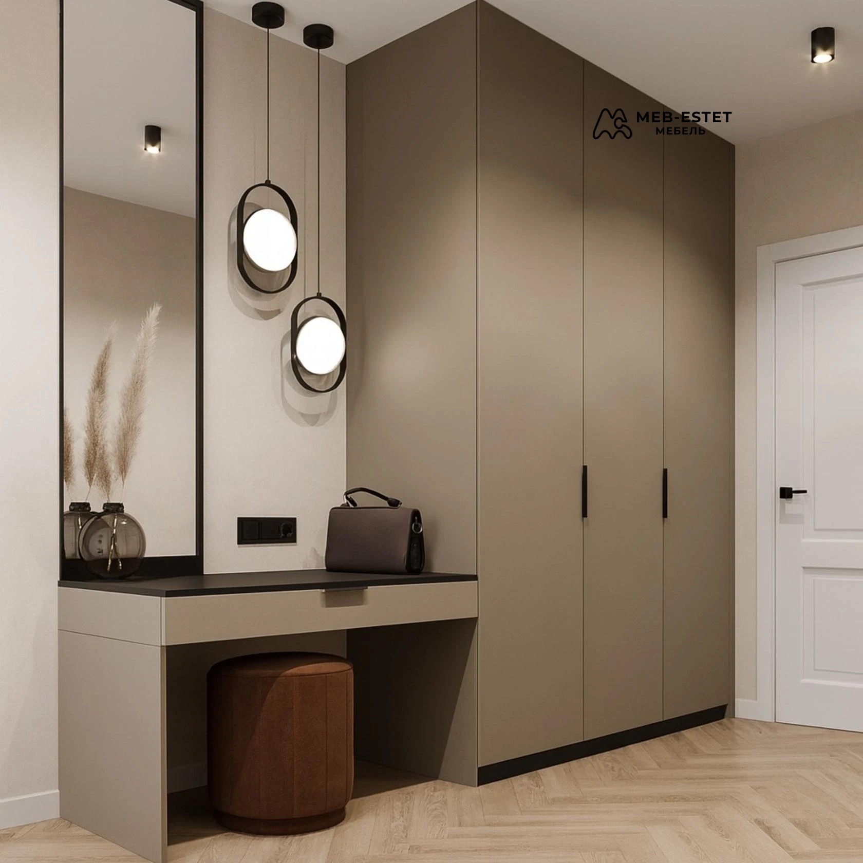 Компактная встроенная система для прихожей, сочетающая платяной шкаф и консоль с ящиком. Выполнена в премиальном матовом МДФ, строгие вертикальные ручки чёрного цвета подчёркивают минималистичный профиль.