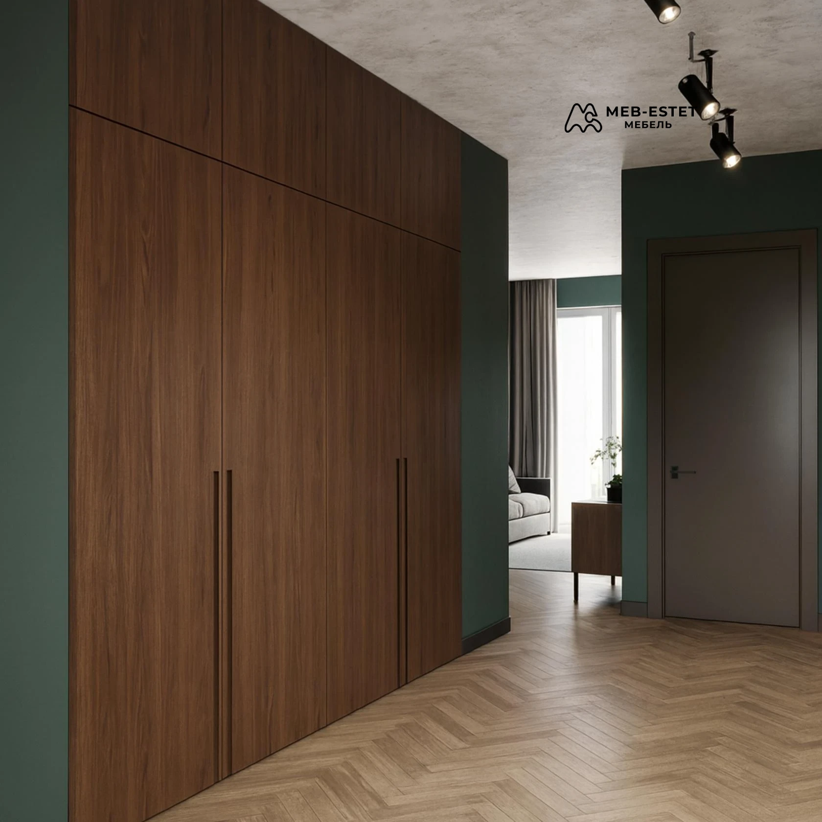 Встроенный распашной шкаф из шпона под потолок — решение для холла и прихожей в стиле минимализм. Чёткие скрытые фасады и длинные интегрированные ручки обеспечивают спокойный графичный силуэт.