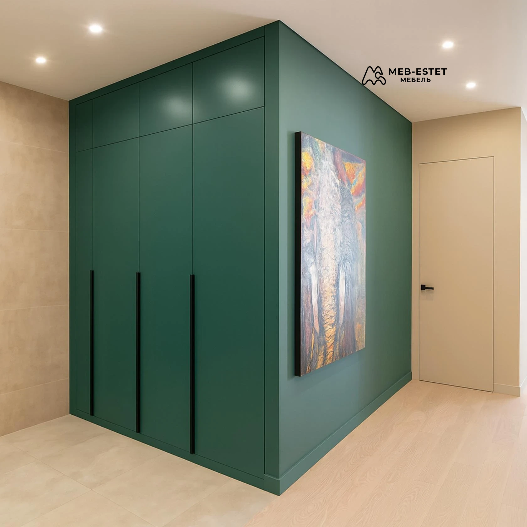 Премиальный встроенный распашной шкаф в прихожую, выполненный в матовой зелёной эмали на МДФ. Конструкция «до потолка» с антресолью и тремя полноформатными дверями с длинными чёрными ручками. Разумная глубина позволяет разместить штангу, полки и выдвижные ящики, сохраняя компактность коридора.