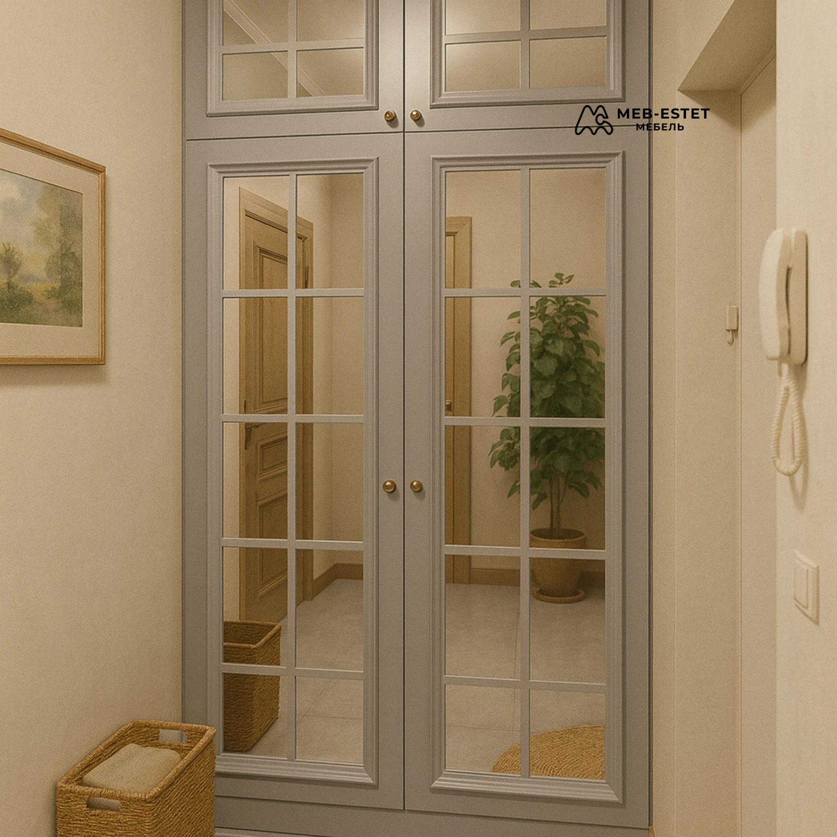 Элегантный встроенный шкаф в прихожую в неоклассическом стиле: окрашенные МДФ фасады серого тона с зеркальными вставками, декоративной раскладкой и латунными ручками. Комплект из двух распашных дверей и антресолей.