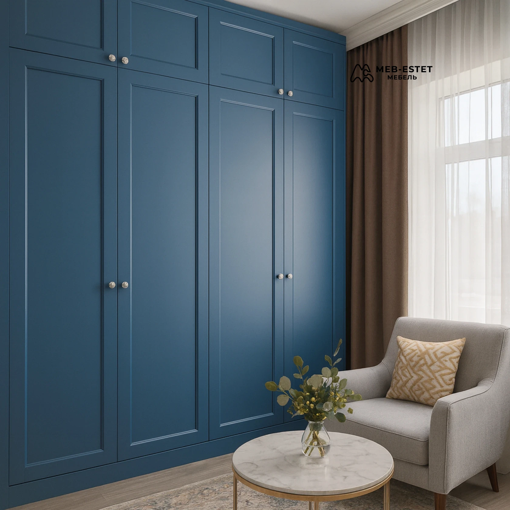 Строгий встроенный платяной шкаф в неоклассическом стиле — решение для оформления спальни в премиум-сегменте. Фасады — окрашенный МДФ с фрезеровкой, матовая эмаль насыщенного синего оттенка. Высота до потолка увеличивает вместимость, верхние антресоли добавляют хранение для сезонных вещей.