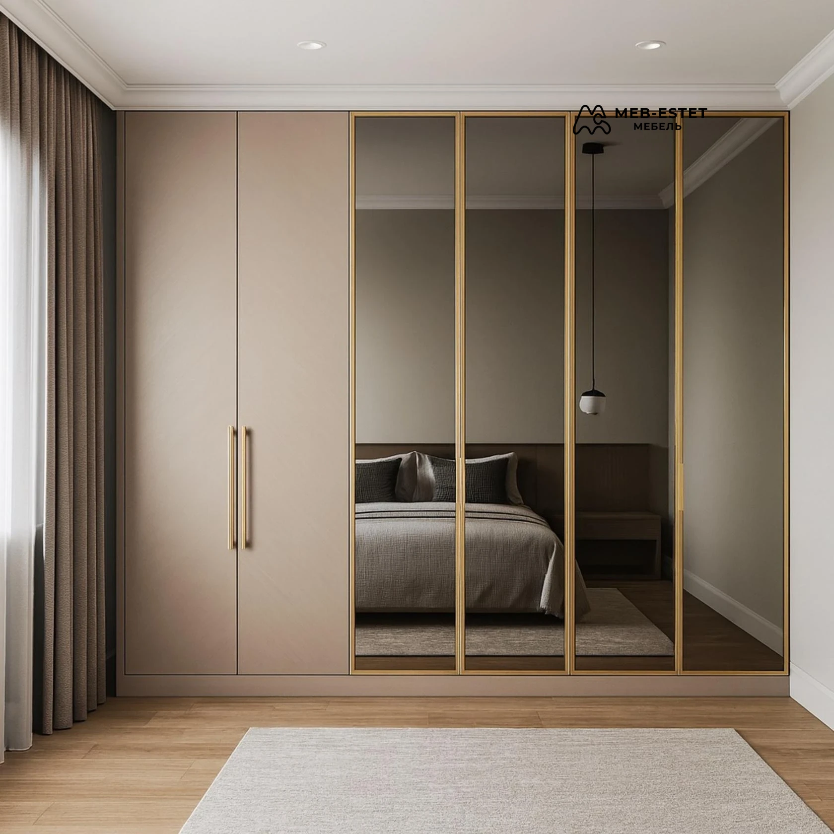 Элегантный встроенный шкаф с матовыми фасадами и зеркальными дверями в золотом профиле. Решение для спальни — с продуманной внутренней планировкой и качественной фурнитурой для плавного открывания.
