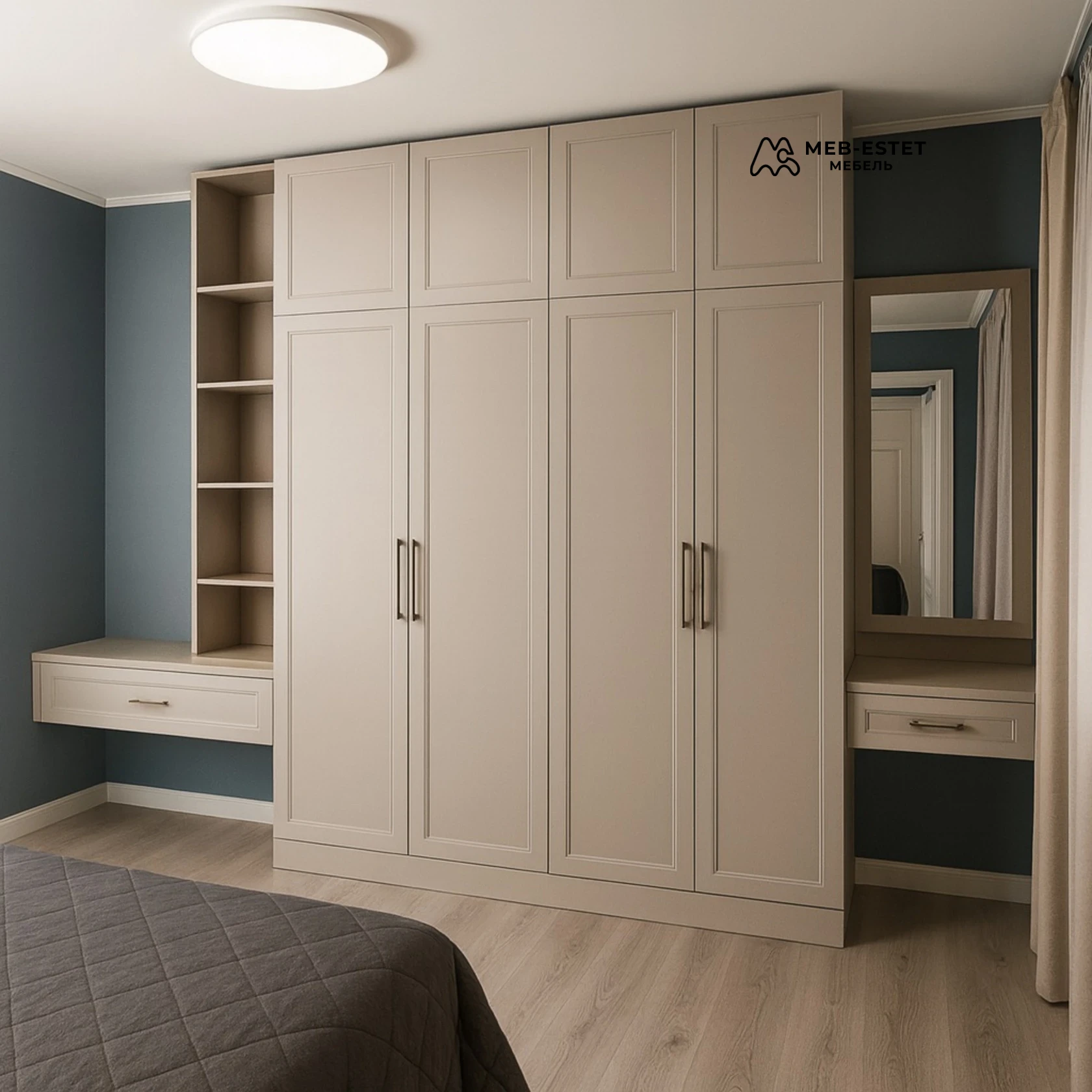 Стильный встроенный платяной шкаф премиум-класса для спальни. Фасады выполнены из МДФ с матовой эмалью и аккуратной фрезеровкой, что придаёт мебели спокойный неоклассический характер. Модель включает верхние антресоли, вертикальный пенал с открытыми полками и две выдвижные тумбы с зеркалом — удобная зона для аксессуаров и утренних процедур.