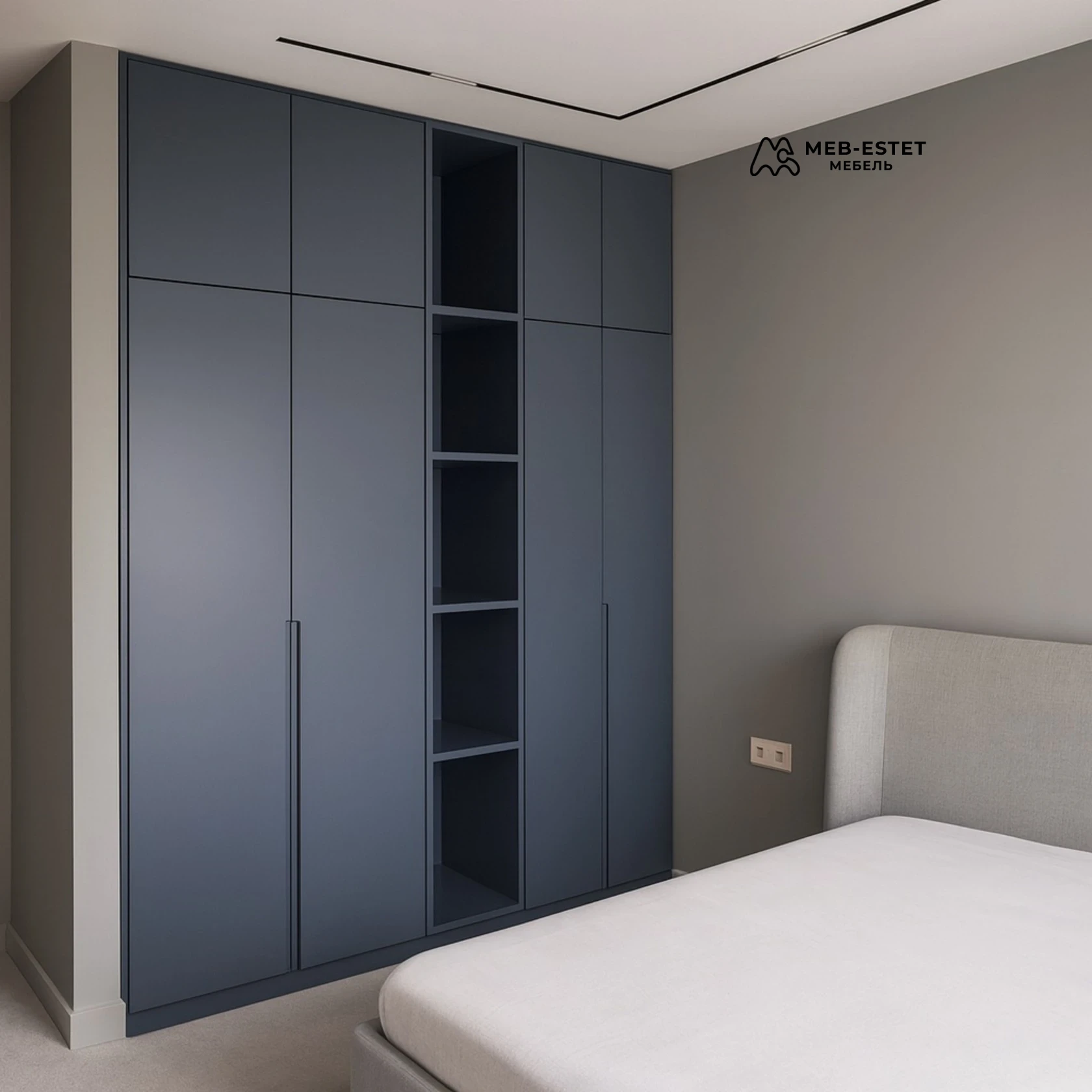 Современный встроенный шкаф премиум-класса в матовом синем оттенке. Корпус и фасады из МДФ с эмалевым матовым покрытием, скрытые петли и направляющие с доводчиками гарантируют мягкое закрытие и долговечность. Центральная открытая секция — акцент для декора или текстиля.