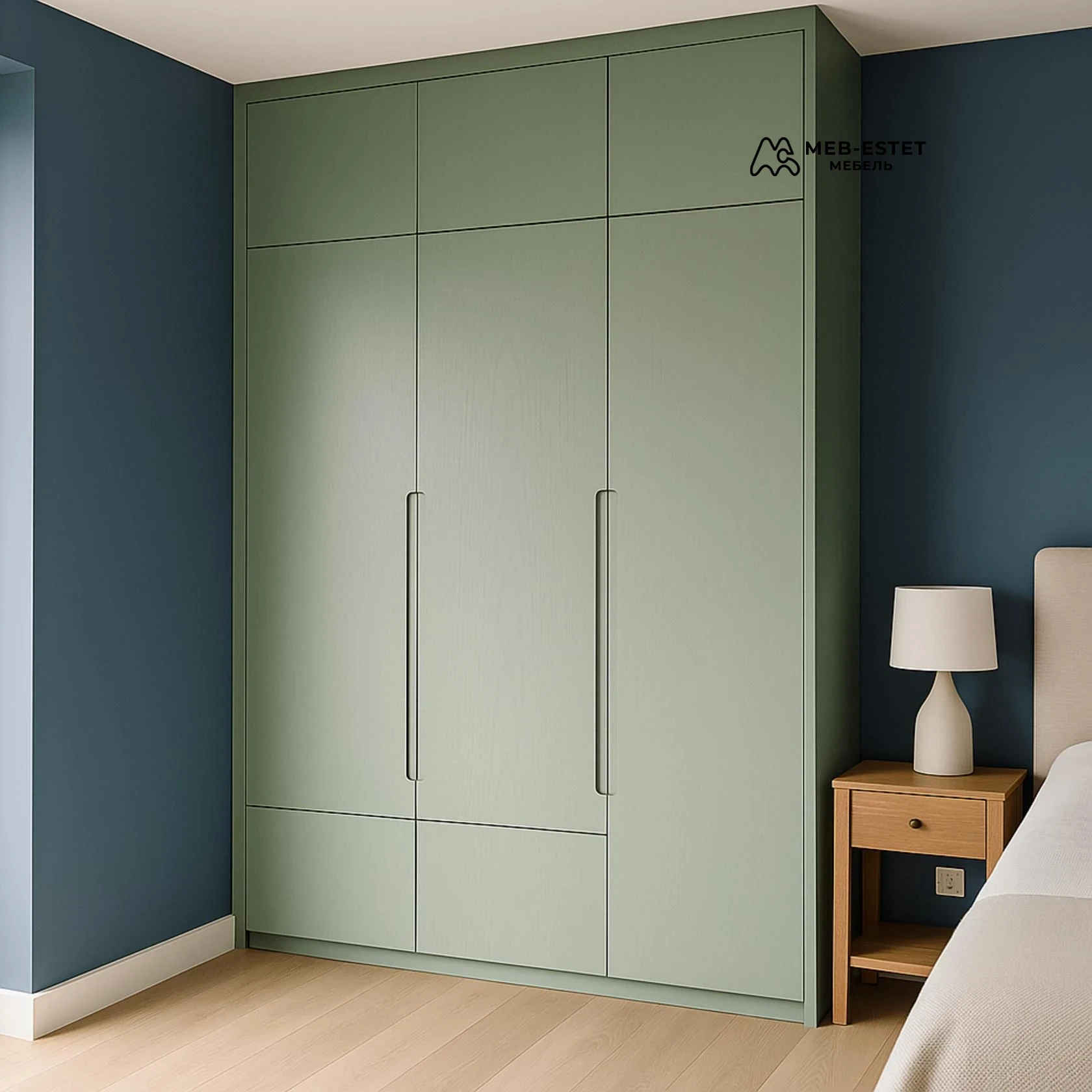 Элегантный встроенный распашной шкаф в мягком зелёном оттенке — решение для тех, кто ценит лаконичную форму и премиальное исполнение. Фасады выполнены из МДФ с матовой эмалью, минималистичные интегрированные ручки обеспечивают цельный визуальный образ.