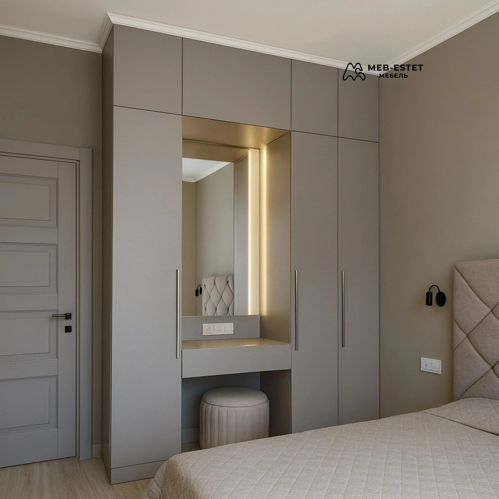 Элегантный встроенный шкаф с нишей для туалетного столика — решение для современной спальни. Изготовление по индивидуальным размерам, плотная посадка до потолка и скрытые выдвижные механизмы обеспечивают долговечность и аккуратный силуэт.