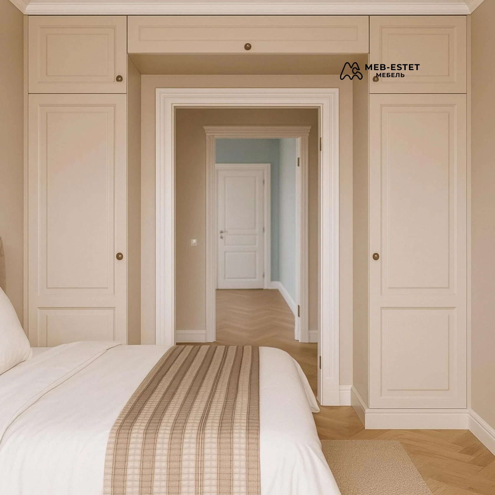 Индивидуальный встроенный шкаф, аккуратно обрамляющий дверной проём. Классические филёнчатые фасады в кремовом тоне подчеркнуты аккуратным карнизом и круглыми ручками — решение для тех, кто ценит элегантность и порядок.