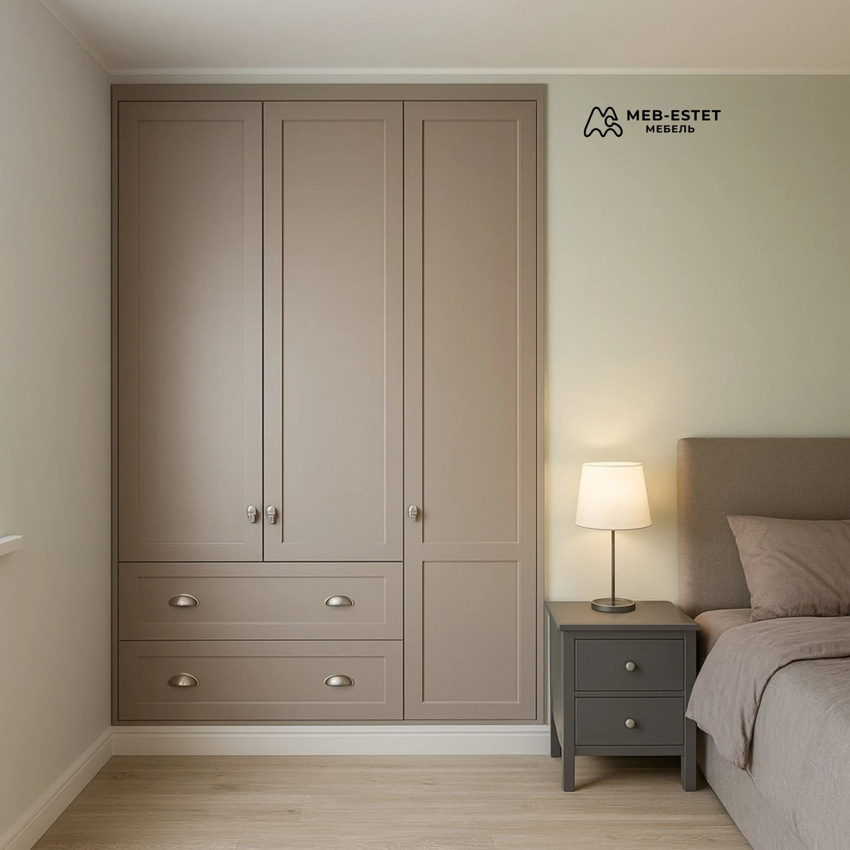 Встроенный распашной шкаф для спальни в неоклассическом духе. Корпус — ЛДСП 18 мм, фасады — крашеный МДФ с матовой эмалью и легкой фрезеровкой, видимые ручки — классические накладные и чашечные на ящиках. Ящики на шариковых направляющих полного выдвижения, петли с доводчиками, усиленные крепления для антресолей.