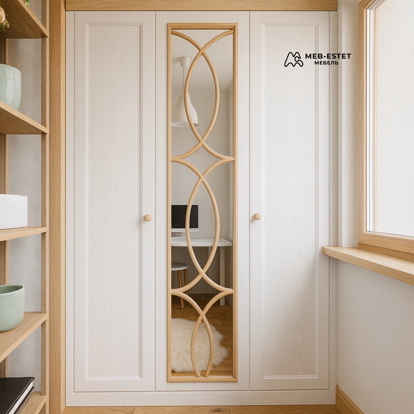 Изящный встроенный распашной шкаф под заказ — решение для тех, кто ценит премиальное исполнение и аккуратные детали. Фасады — окрашенный МДФ в светлом тоне с натуральными деревянными вставками и декоративной резной накладкой на центральном зеркале.