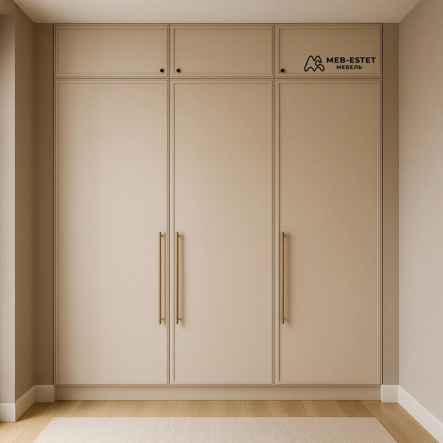 Встроенный платяной шкаф в неоклассическом стиле, выполнен под потолок с верхними антресолями. Лаконичная раскладка фасадов и длинные металлические ручки подчёркивают премиальное исполнение.