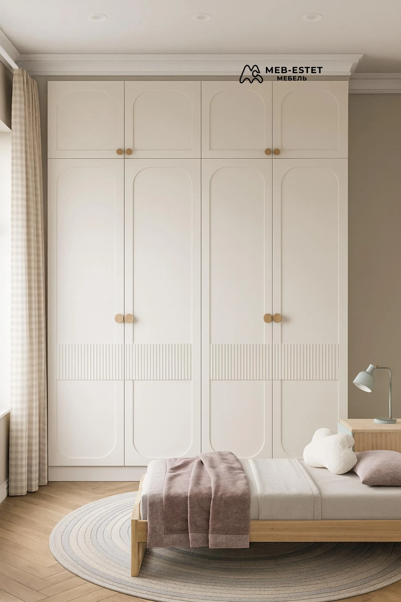 Встроенный распашной шкаф по индивидуальным размерам — стильное и функциональное решение для спальни. Фасады из МДФ с эмалевым матовым покрытием, мягкая фрезеровка и реечная вставка придают изделию скандинавский характер.