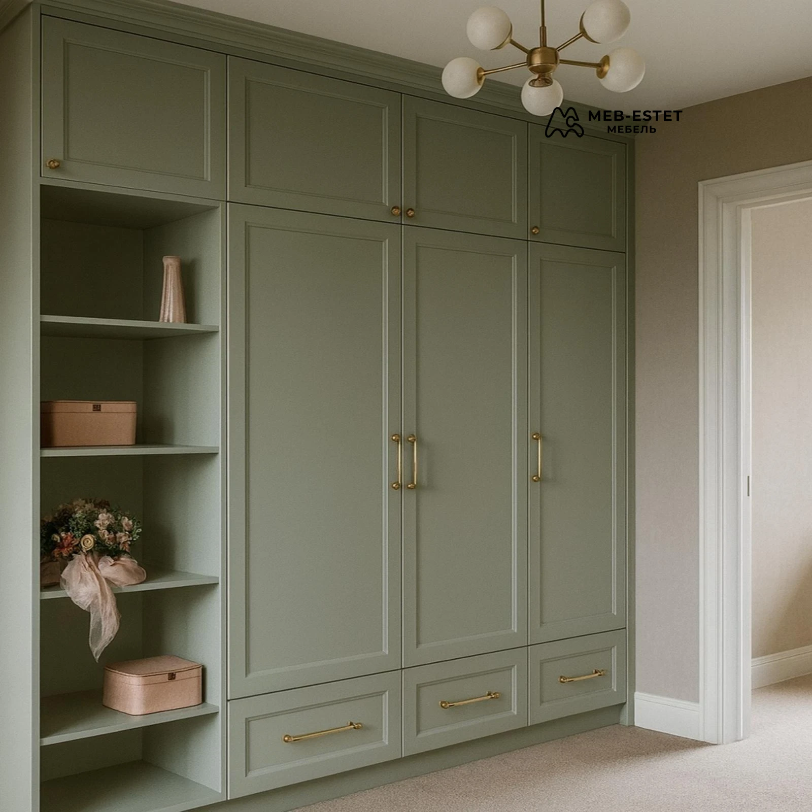 Встраиваемый шкаф в неоклассическом стиле, окрашен в мягкий зелёный матовый тон. Филёнчатые фасады из МДФ, латунная фурнитура, два выдвижных ящика внизу и открытые полки слева — продуманное сочетание эстетики и функционала.