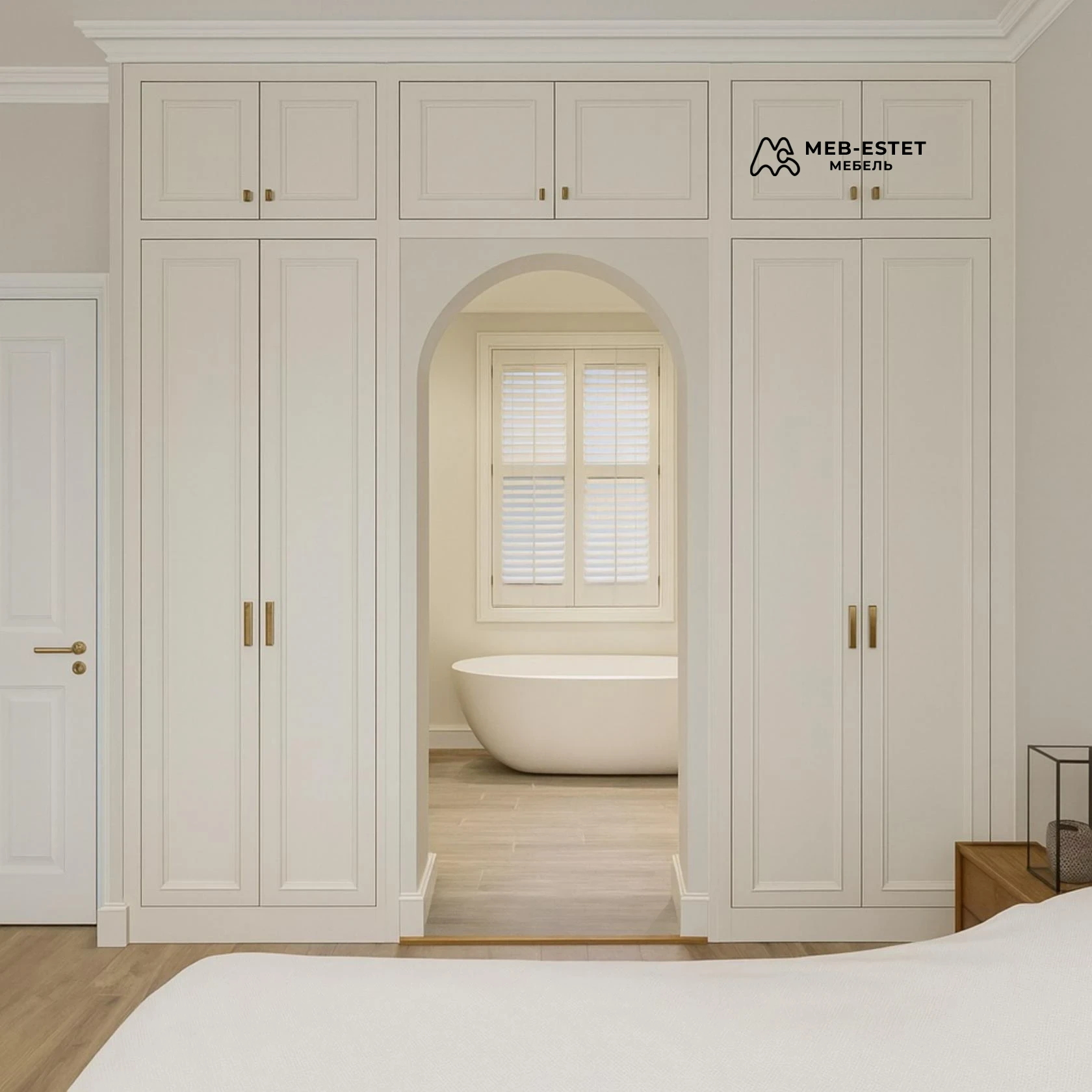 Встроенный платяной шкаф с арочным проходом — решение для классической спальни с выходом в ванную. Выполнен в светлой кремовой эмали на МДФ с декоративной фрезеровкой и латунными ручками.
