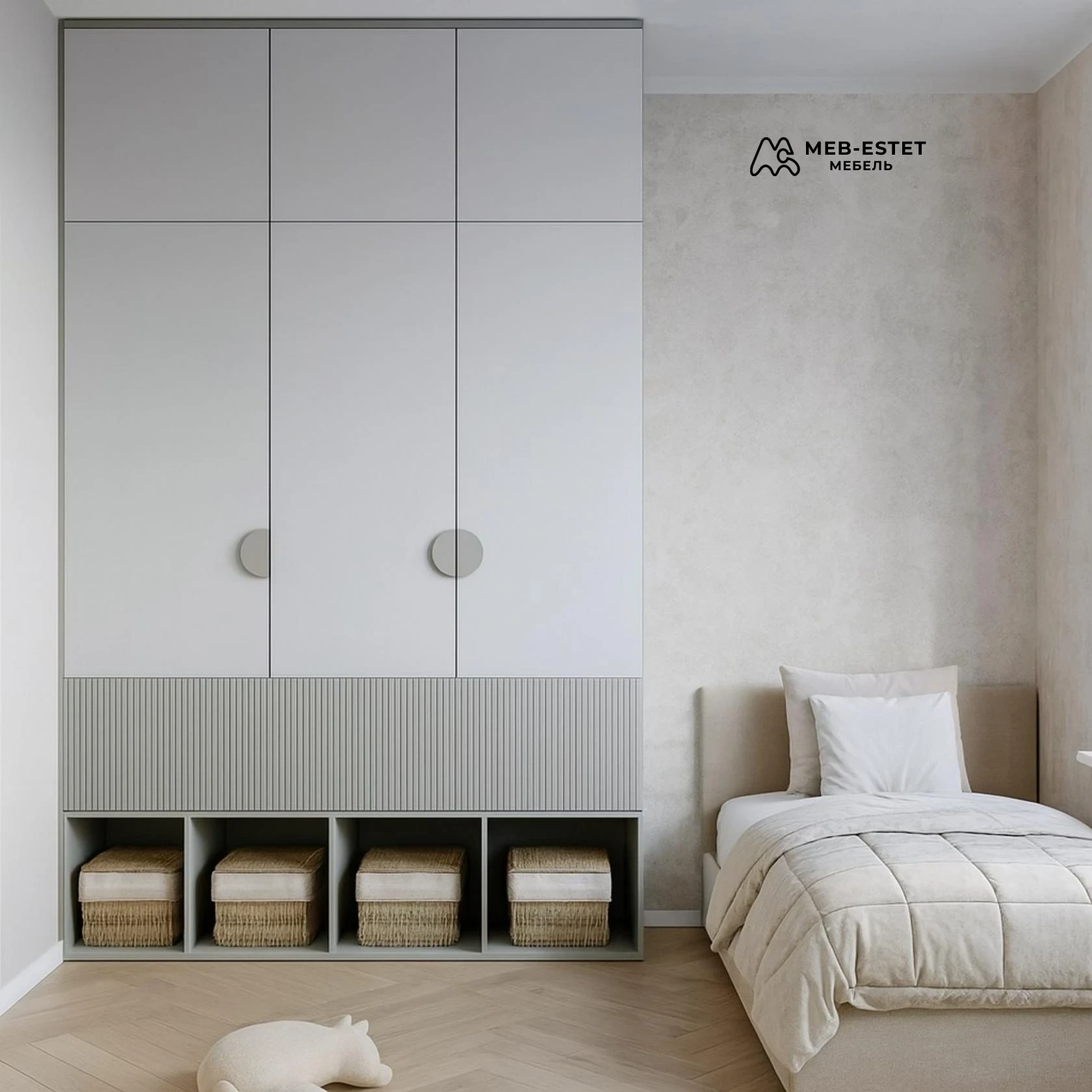 Высокий встроенный шкаф по индивидуальным размерам, выполнен в скандинавском стиле. Композиция сочетает гладкие фасады и реечную фрезеровку в нижней части, открытые кубы для корзин и вместительные секции для одежды.