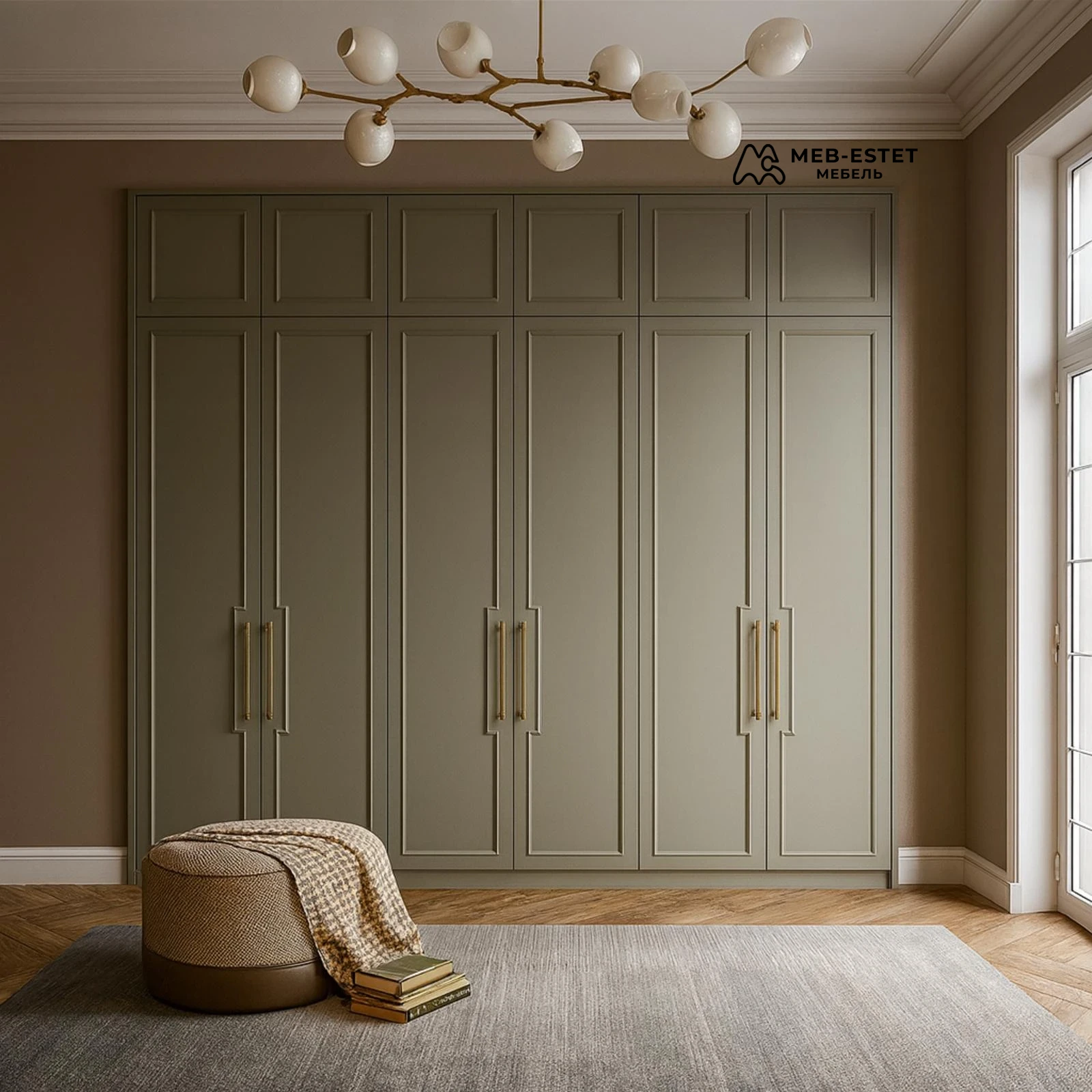 Полностью встроенный платяной шкаф премиум-класса с филёнчатыми фасадами и матовой покраской. Стилистика — неоклассика в современной интерпретации: аккуратные рамки на дверях, удлинённые латунные ручки и верхние антресоли.