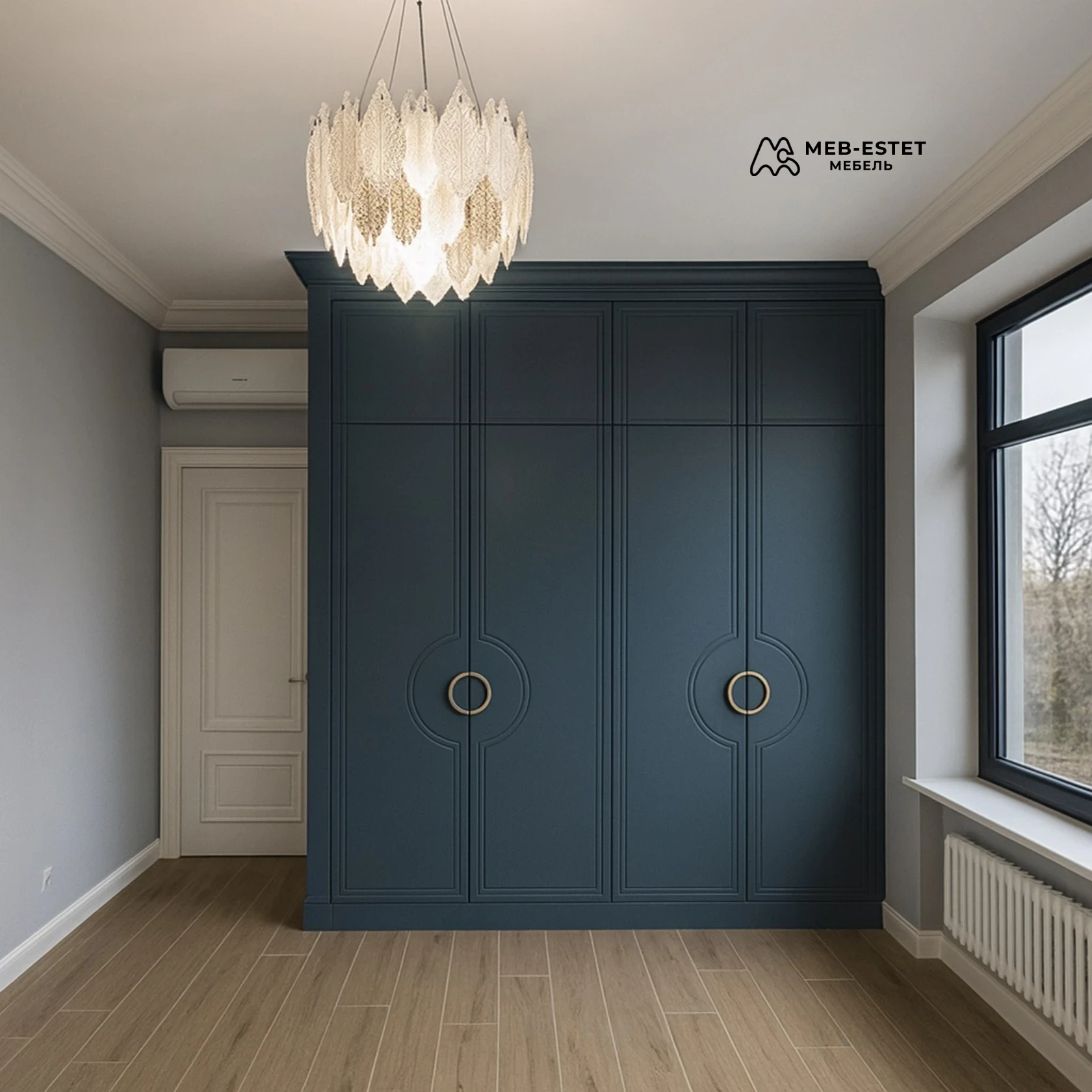 Элегантный встроенный шкаф глубокого синего цвета с фрезерованными фасадами и крупными металлическими кольцевыми ручками. Решение для тех, кто ценит классические детали в современной отделке.