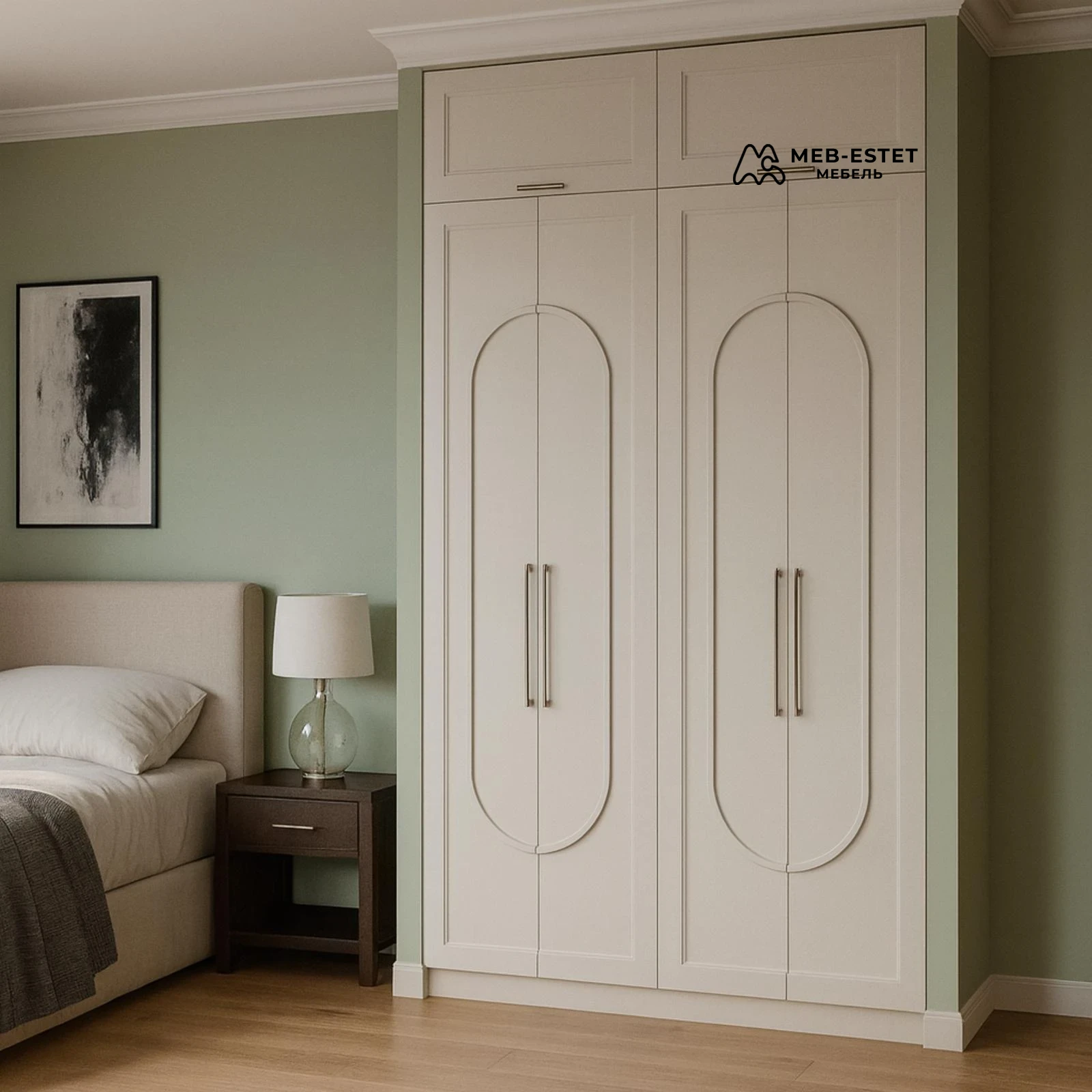 Элегантный встроенный шкаф под заказ, выполненный в светло‑кремовом оттенке с декоративной фрезеровкой на фасадах. Идеально подходит для спальни: высокий корпус с антресолью обеспечивает максимальную вместимость при компактной ширине.