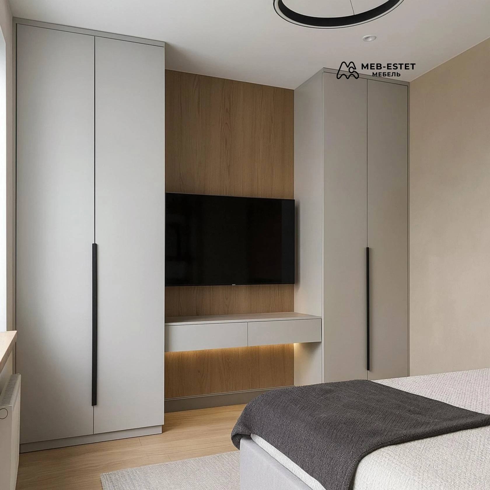 Элегантный встроенный комплект для спальни: два высоких шкафа по бокам и центральная ниша под телевизор с плавающей тумбой. Фасады — матовый МДФ серого тона, глубокие вертикальные черные ручки и древесная декоративная панель в нише создают спокойный контраст.