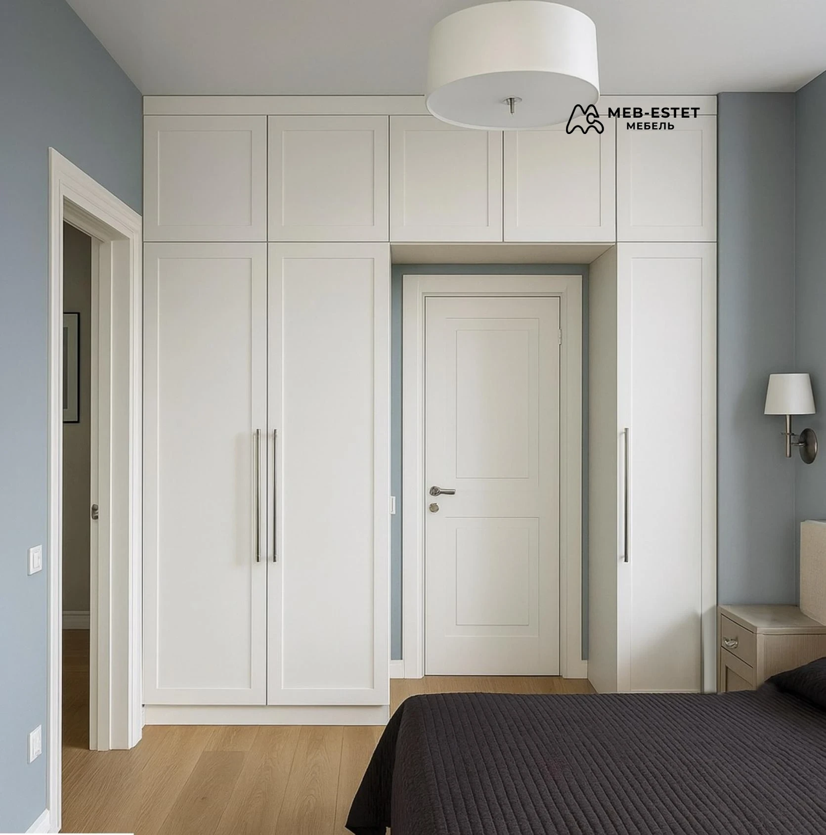Индивидуальный встроенный шкаф вокруг дверного проёма — сдержанное и функциональное решение для спальни. Изготовлен из МДФ с эмалевым покрытием, филёнчатые фасады и длинные металлические ручки создают премиальный вид.