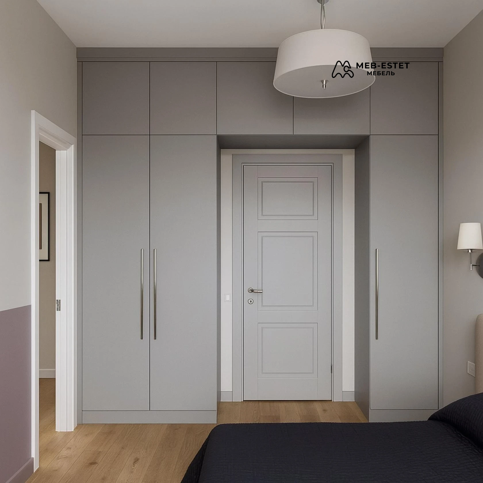 Премиальный встроенный шкаф, аккуратно обрамляющий межкомнатную дверь — решение для компактной спальни. Фасады в спокойном сером тоне, матовая фактура, длинные тонкие ручки из металла добавляют строгой элегантности.