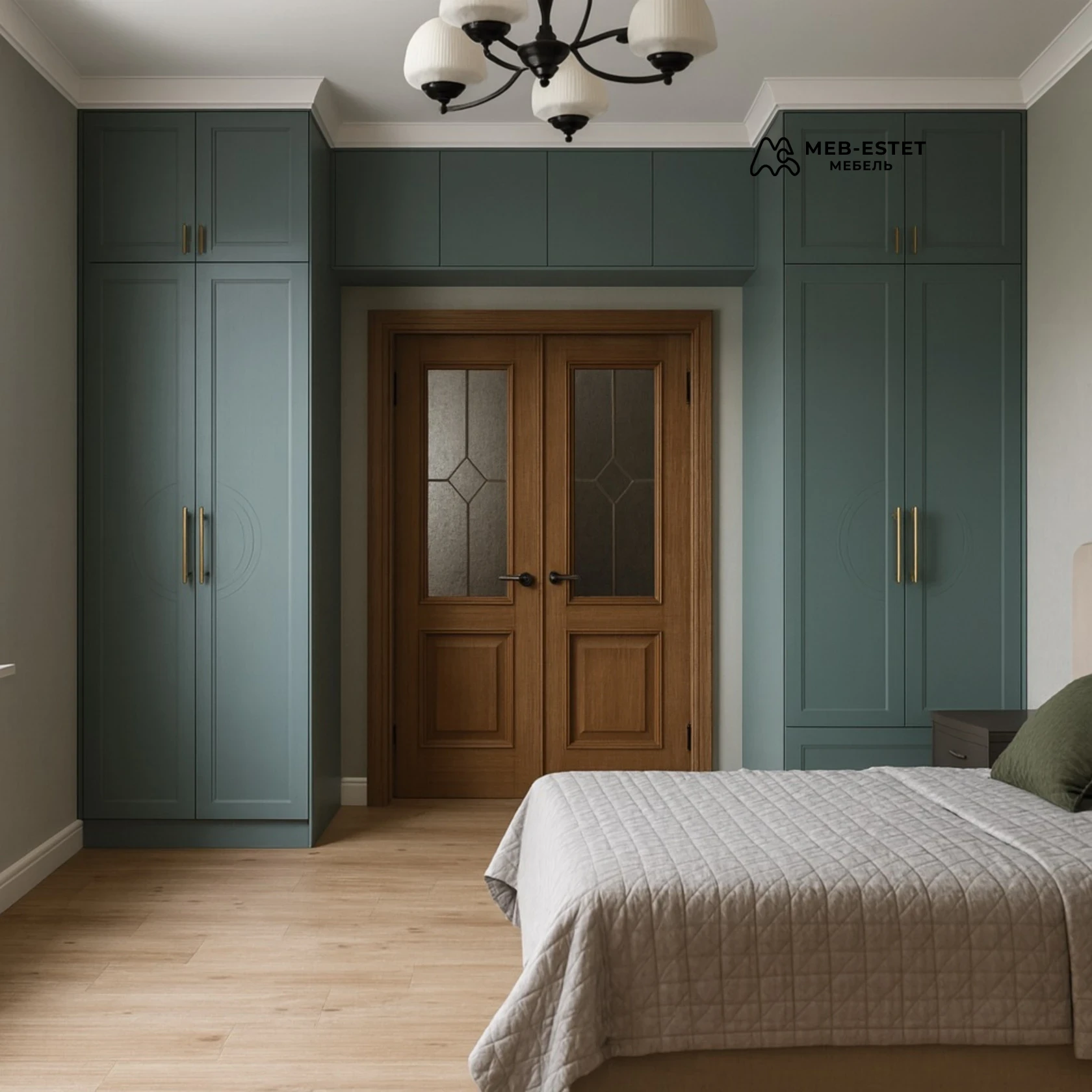 Профессионально выполненный встроенный шкаф-пенал вокруг дверного проёма. Корпус и фасады — окрашенный МДФ с фрезеровкой, матовое покрытие; аккуратная торцевая обработка и латунные ручки повышают тактильное впечатление.