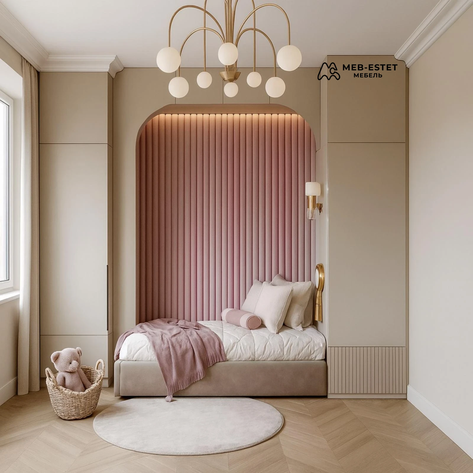 Композиция — встроенный шкаф-альков с мягкой вертикальной панелью и подсветкой, выполненная на заказ. Решение сочетает вместительные пеналы по бокам и уютную нишу для односпальной кровати, акцент — текстильная рифленая спинка в нежно-розовом тоне.