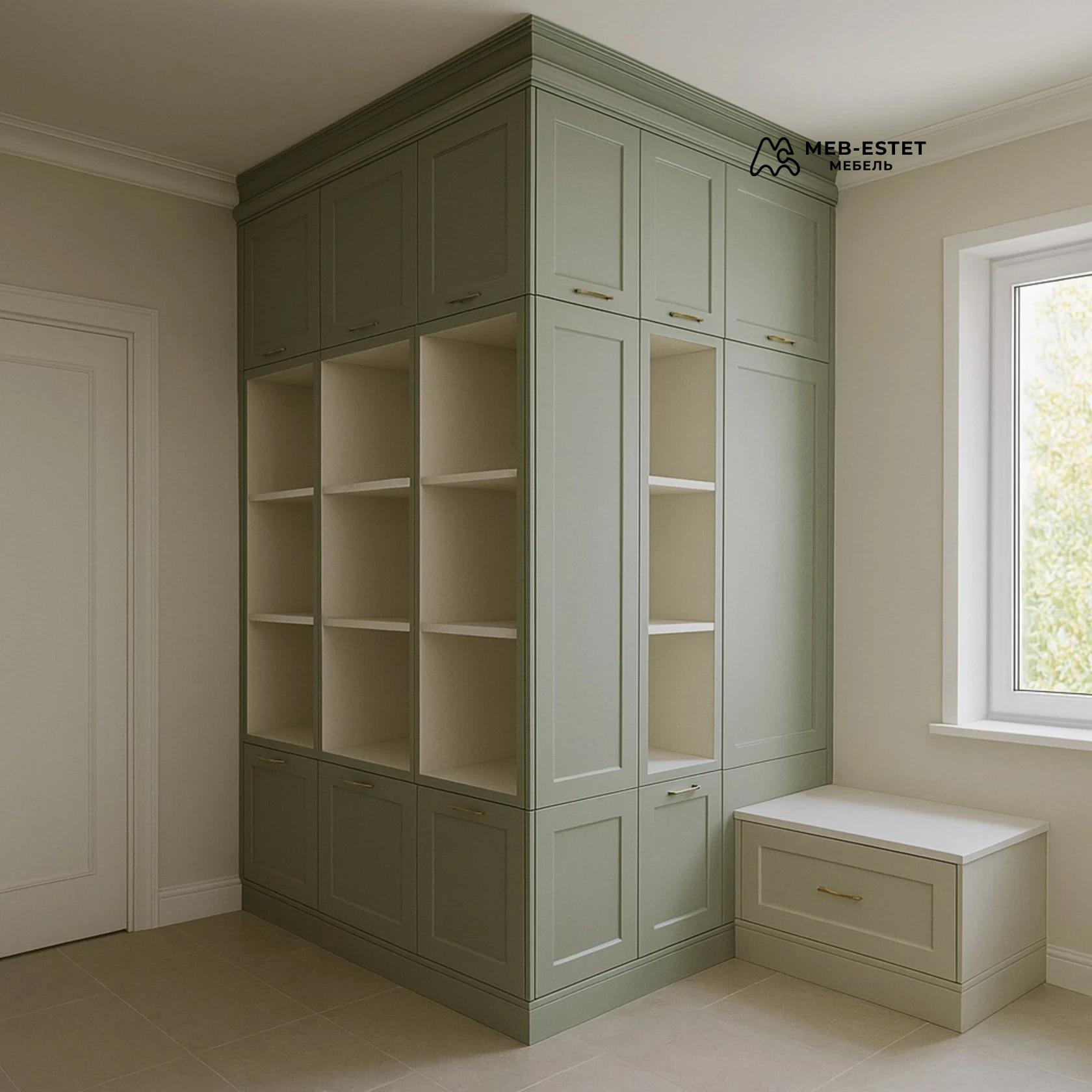 Угловой встроенный шкаф премиум-класса с открытыми нишами и закрытыми фасадами. Корпус и фасады — окрашенный МДФ с фрезеровкой, аккуратный карниз и цоколь. Внутри — регулируемые полки, антресоли и нижние секции для ящиков или обуви.
