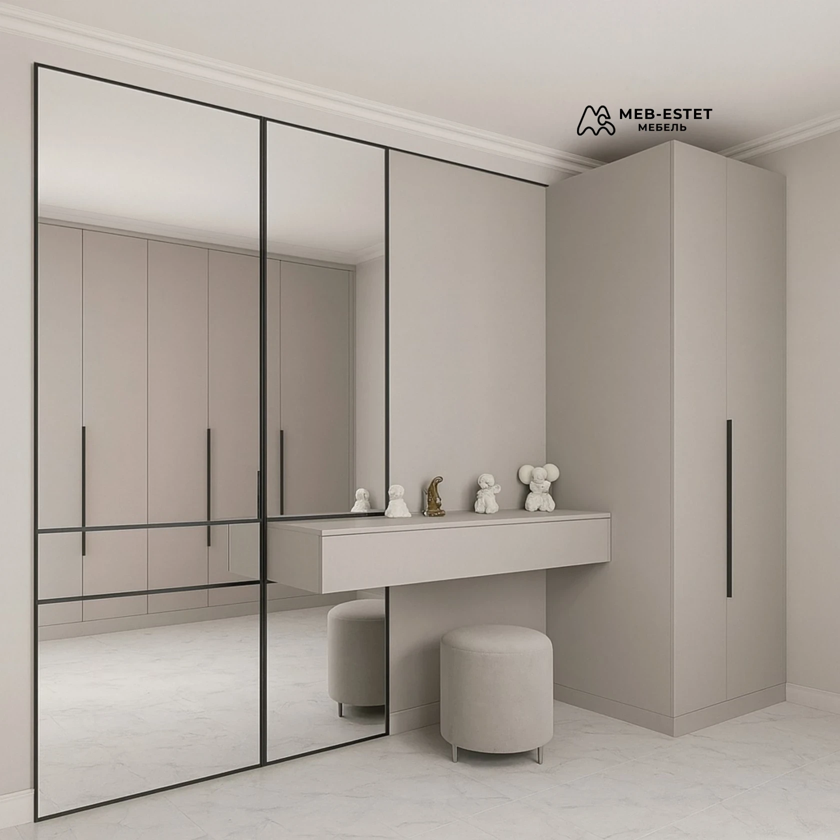 Современный встроенный шкаф для прихожей с крупными зеркальными полотнами в тонкой алюминиевой рамке и подвесной консолью с ящиком. Конструкция — корпус из МДФ/ЛДСП с крашенным матовым фасадом, зеркала с безопасной пленкой и аккуратными интегрированными ручками.