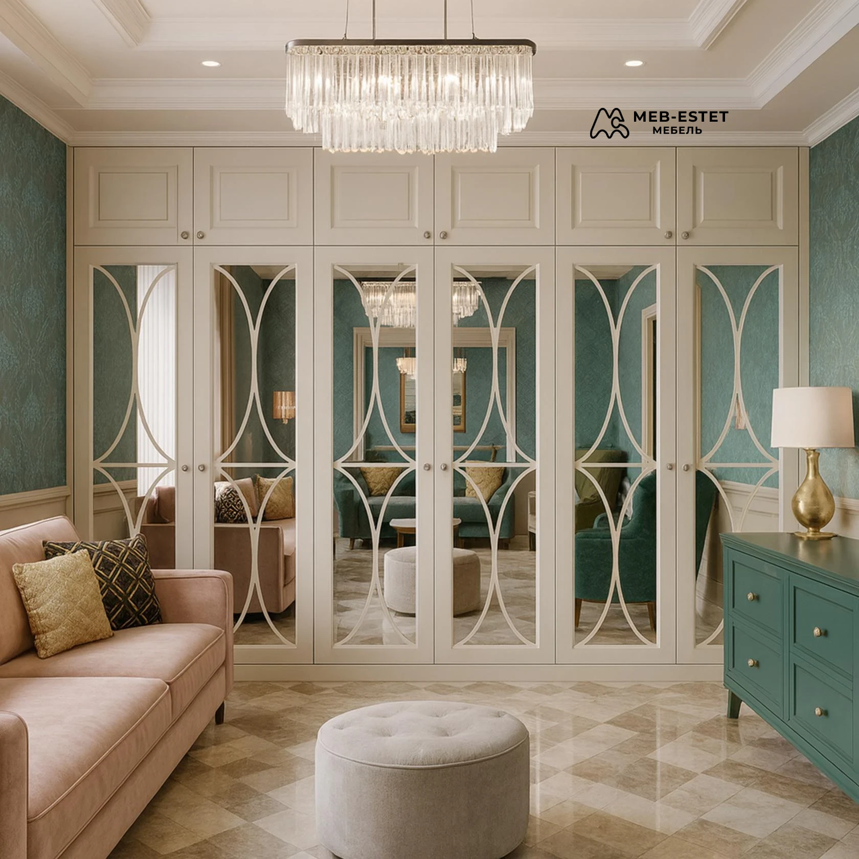 Встроенный шкаф-гардероб в неоклассическом стиле с зеркальными распашными дверями и декоративными фрезерованными накладками. Элегантное решение для гостиной или прихожей, визуально расширяет пространство.