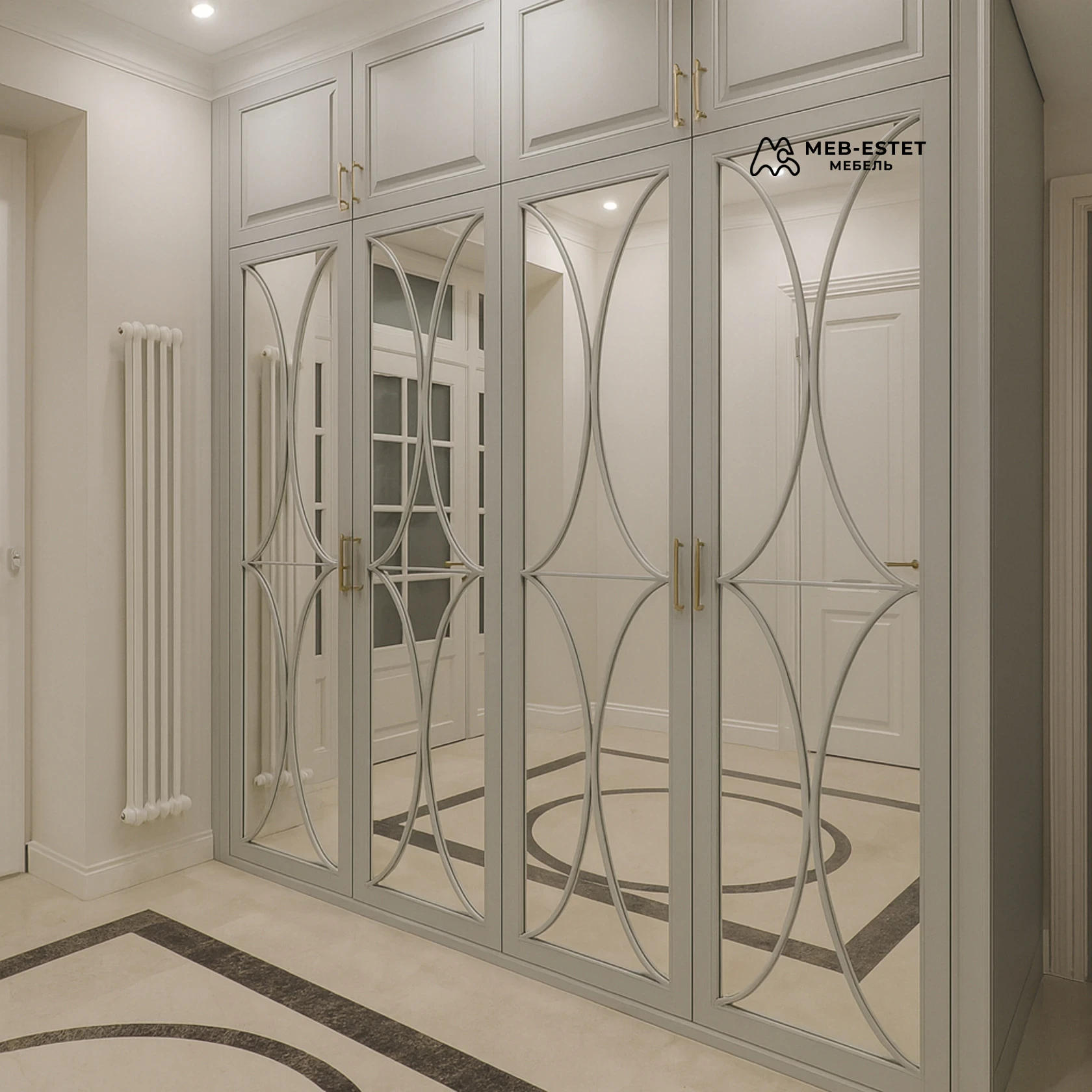 Элегантный встроенный шкаф в неоклассическом стиле для прихожей. Фасады — зеркала с фрезерованными МДФ накладками, окрашенные в мягкий серый тон; ручки из латуни. Конструкция до потолка с антресолями и интегрированной подсветкой.