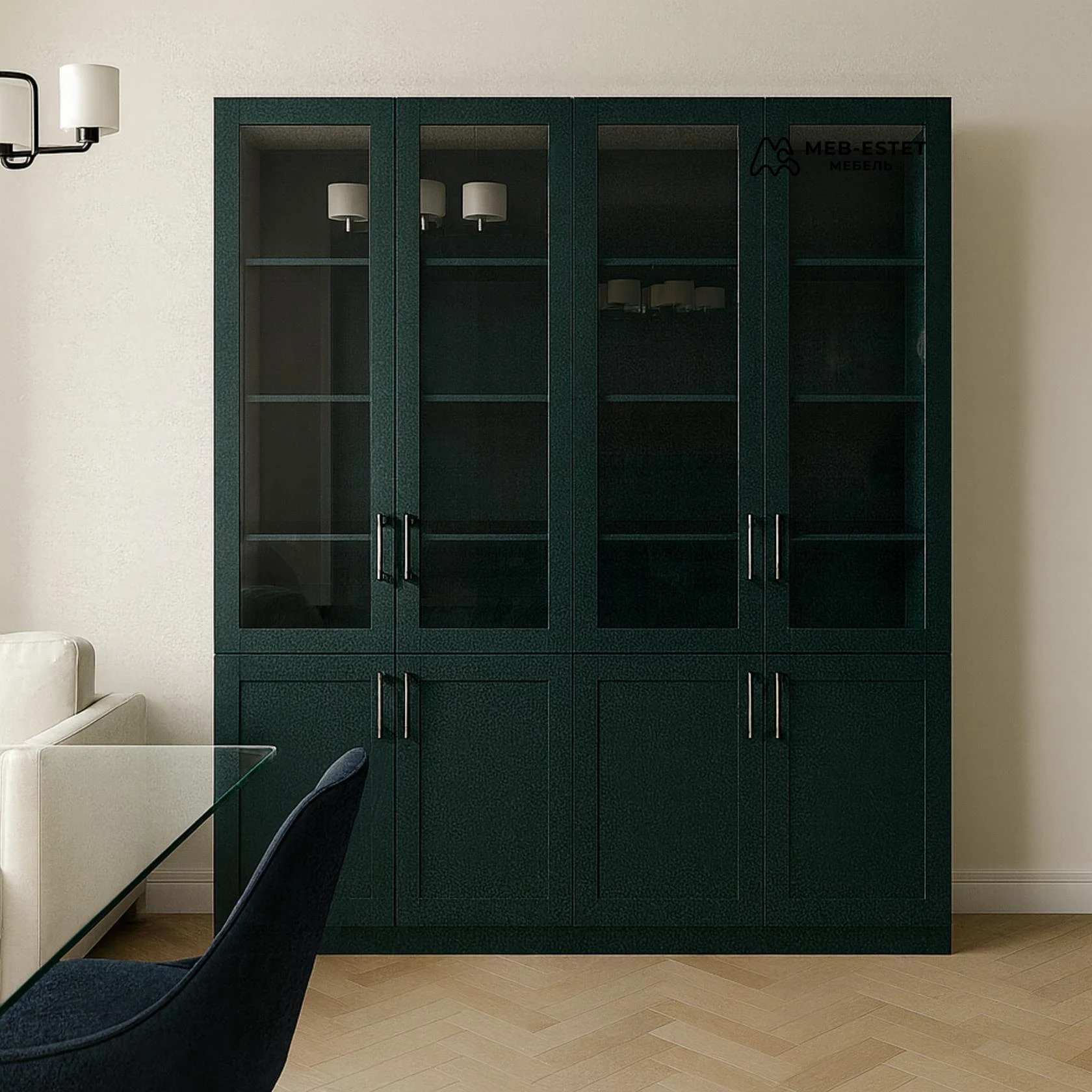 Элегантная высокий шкаф-витрина изготавливается по индивидуальным размерам и подчёркивает премиальный характер интерьера. Верхняя часть с тонированным стеклом идеально подходит для посуды и декора, нижняя — для скрытого хранения.