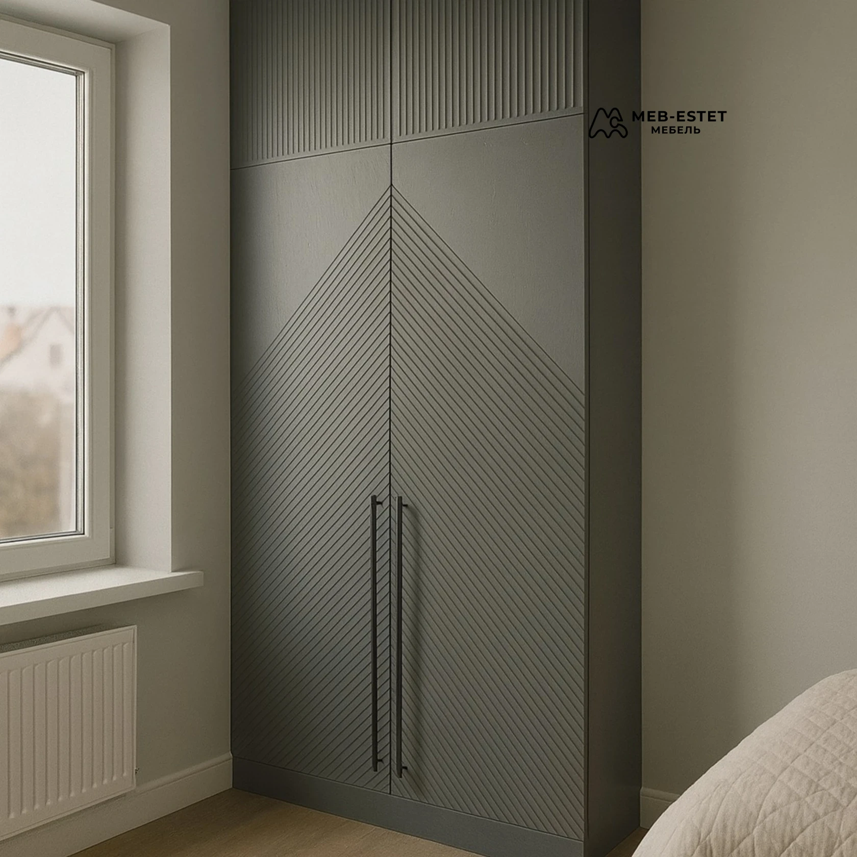 Элегантный высокий распашной шкаф премиум-класса, выполнен из окрашенного МДФ с фрезерованным реечным рисунком фасада. Точная фрезеровка создаёт выразительную диагональную текстуру, верхняя секция — с тонкой вертикальной рейкой.