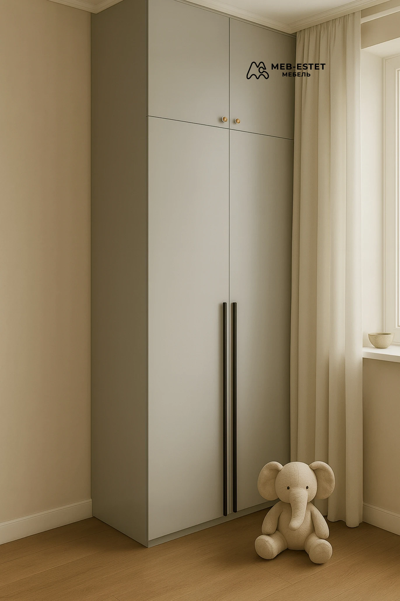 Высокий распашной шкаф в спокойной серо‑бежевой гамме — минималистичная система хранения для детской или спальни. Фасады из МДФ с матовой поверхностью, две высокие распашные двери и верхняя антресоль создают удобную зону для одежды и белья.