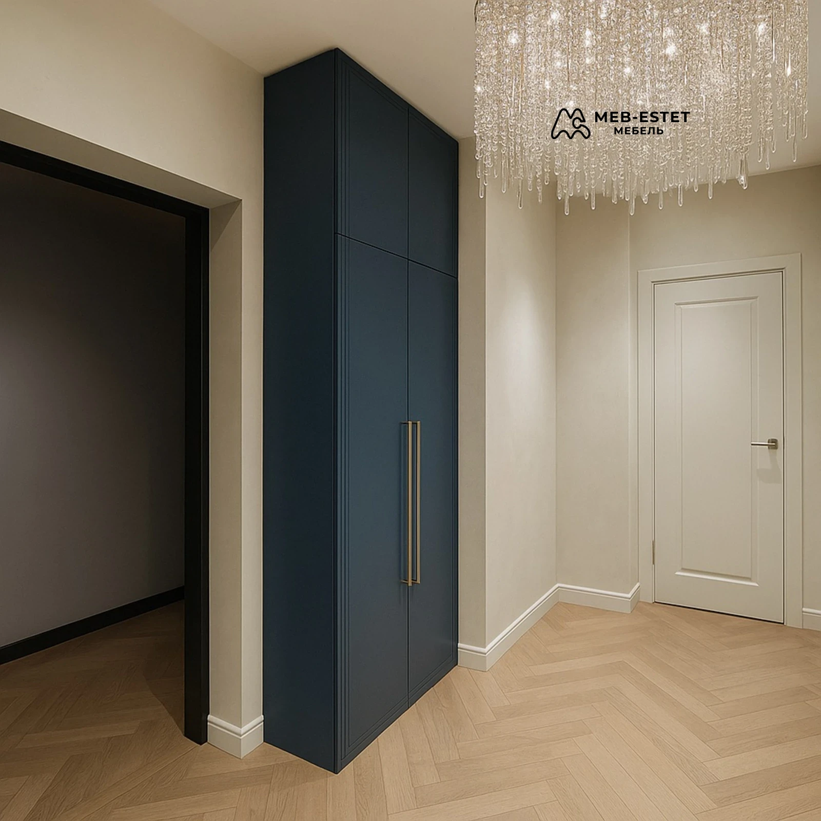 Узкий высокий пенал для прихожей, выполнен на заказ с акцентом на премиум‑отделку и продуманную эргономику. Фасад из крашеного МДФ с тонкой фрезеровкой и длинной бронзовой ручкой. Внутри сочетание полок и штанги для верхней одежды, возможны ящики и подсветка.
